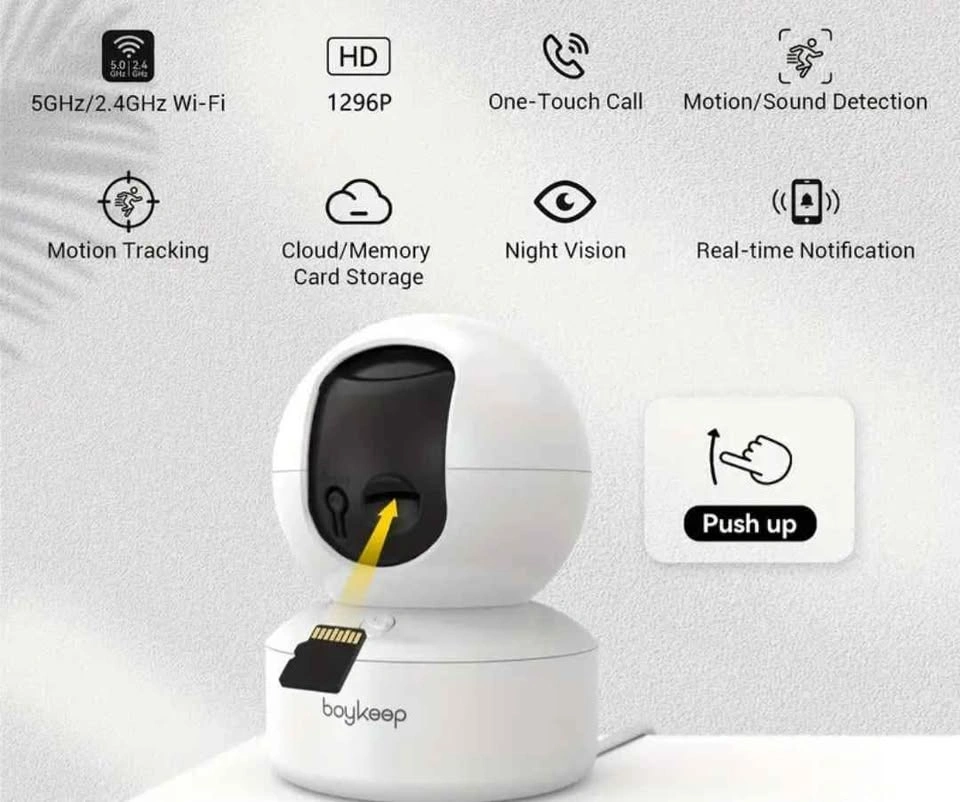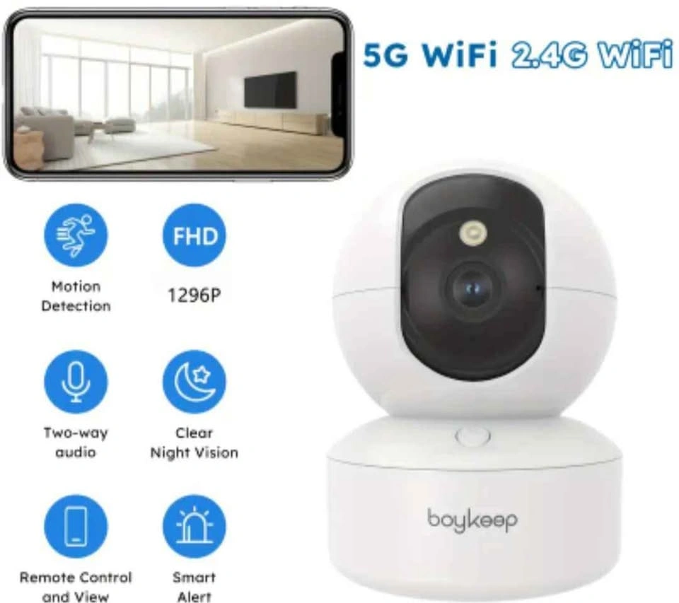 93Boykeep’s indoor security camera is optimized for high speed and low latency, catering to pet monitoring needs with 5GHz and 2.4GHz WiFi for swift real-time image delivery. It’s perfect for use as a pet camera, allowing you to keep an eye on your pets, like cats and dogs, and see what your dog is up to while you’re away. This 360° wifi camera boasts a high-res 2K lens for sharp details, complemented by full-color night vision for comprehensive surveillance. Even in complete darkness, the camera provides full-color night vision, making it easy for you to monitor your yard or room and identify any potential threats or intruders. Boykeep Wi-Fi camera lets you connect with a single touch, featuring built-in two-way audio for instant communication, enhancing family safety and convenience. When your children or seniors need you, simply press the one-touch call button on the Wi-Fi camera to receive an immediate call. Boykeep pet camera has a 360° field of view, providing comprehensive surveillance coverage. It can pan 355°, tilt 110°, offering a complete view of the surrounding environment. When motion is detected, the camera activates intelligent motion tracking, automatically following the movement and capturing every detail. You can also set the camera to focus on specific areas for targeted monitoring. Using the Boykeep indoor monitoring camera allows you to save alert videos on an SD card (not included) or enjoy a 30-day trial of cloud storage, ensuring the security of your data. It also enables 24/7 continuous recording on SD card storage, minimizing the risk of.