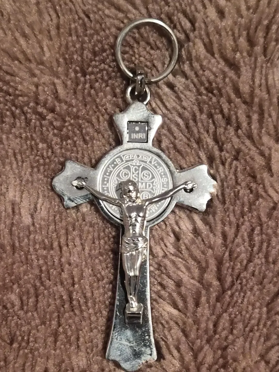 A metal keychain featuring a Saint Benedict crucifix. It has 'INRI' inscribed above the crucifix. The circular medal on the crucifix has various symbols and Latin inscriptions.