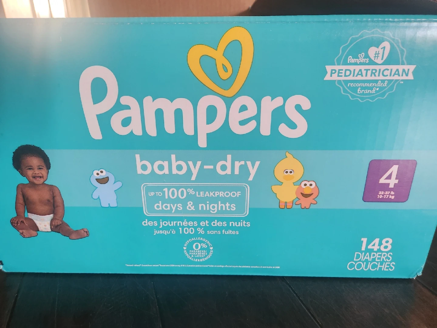 1 sealed sleeve of Pampers Baby-Dry diapers, size 4. These are designed for babies weighing 10-17 kg (22-37 lbs). They offer up to 100% leakproof protection.