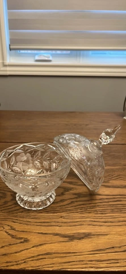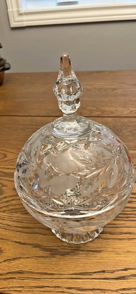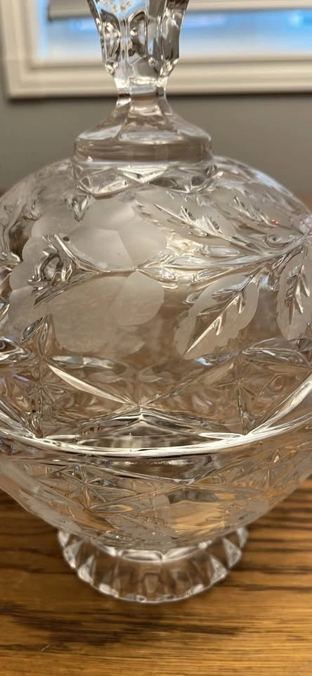 Elegant clear glass candy dish with a faceted finial lid. Features frosted floral and leaf patterns on the lid and a pretty cut glass design on the bottom. Nice for holding candies or as decor.