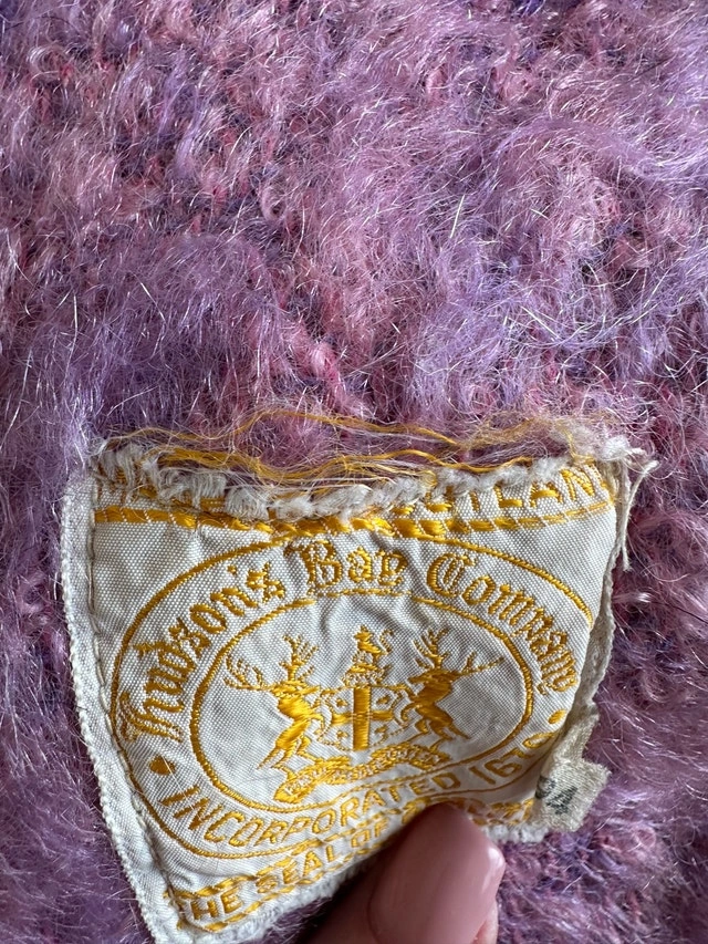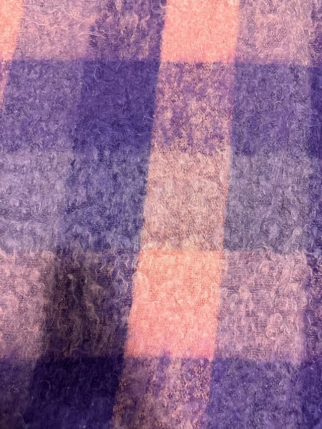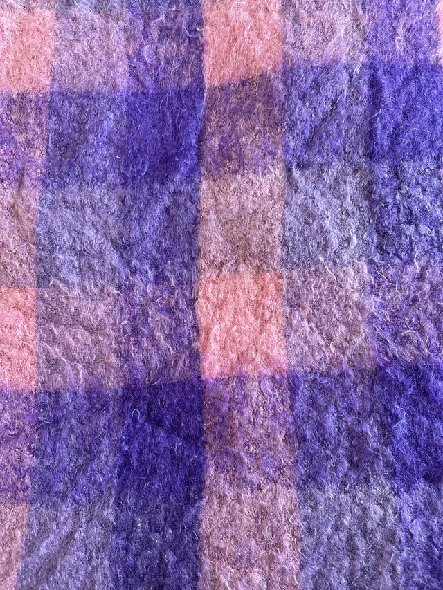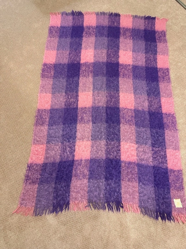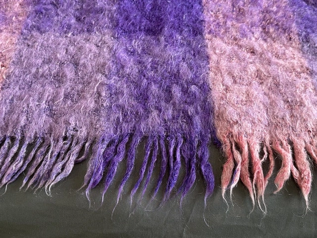 Great condition Made in Scotland 1940-1950. Recently dry cleaned. 75% Mohair 25% Wool 50" x 70". Beautiful pink and purple colors, rare and hard to find. Smoke free home. Pick up in Wolf Willow SE.