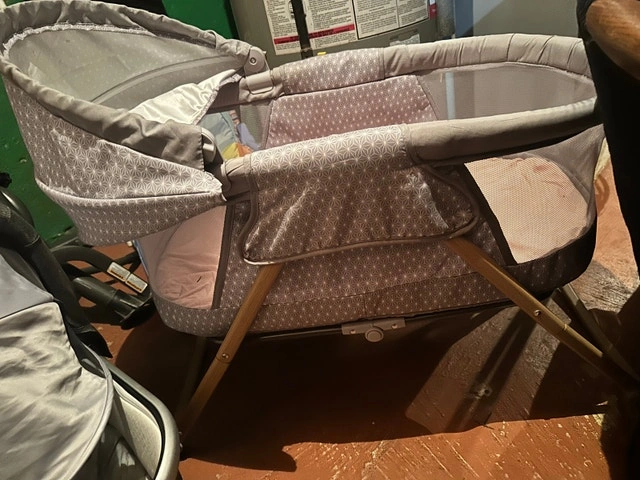 This is a used rocking bassinet, perfect for soothing your little one to sleep with its gentle rocking motion. The bassinet is in good condition and ready for a new home. It features a cozy sleeping area and a sturdy frame for safety. This rocking bassinet has been a lifesaver, creating a serene environment for my baby to drift off to dreamland. However, it's time for it to bring comfort to another family. $65 OBO.