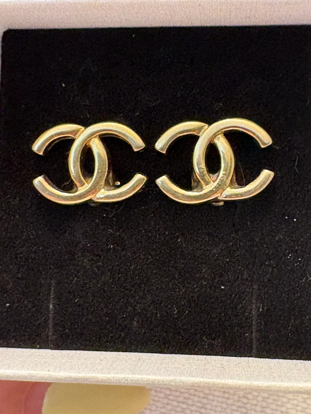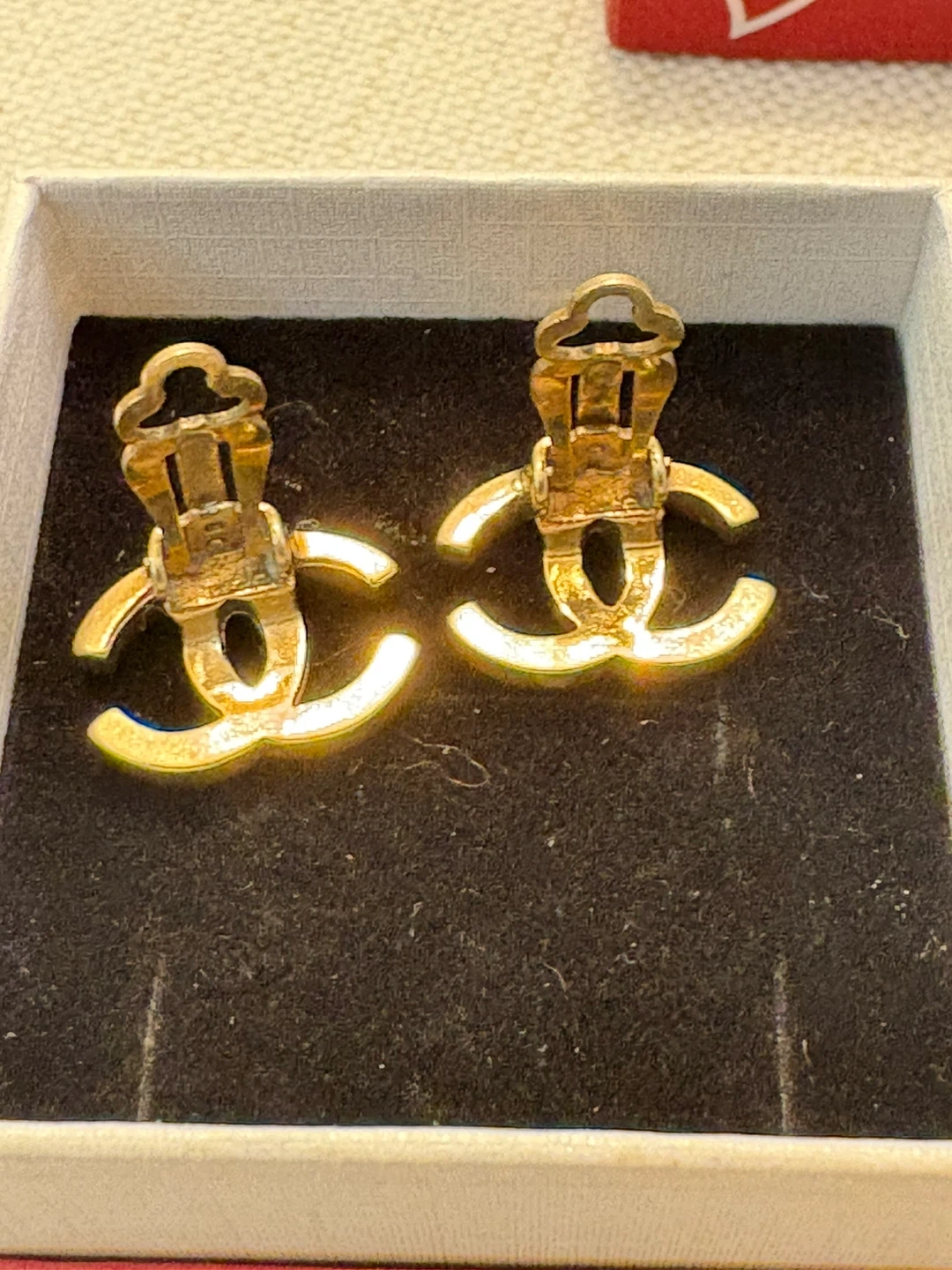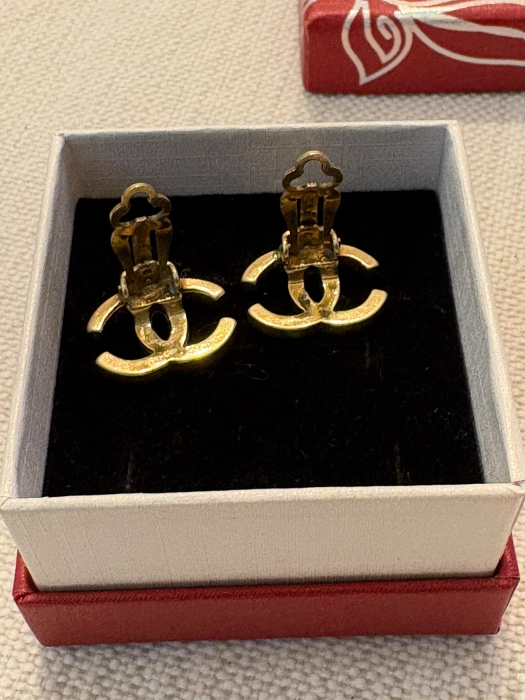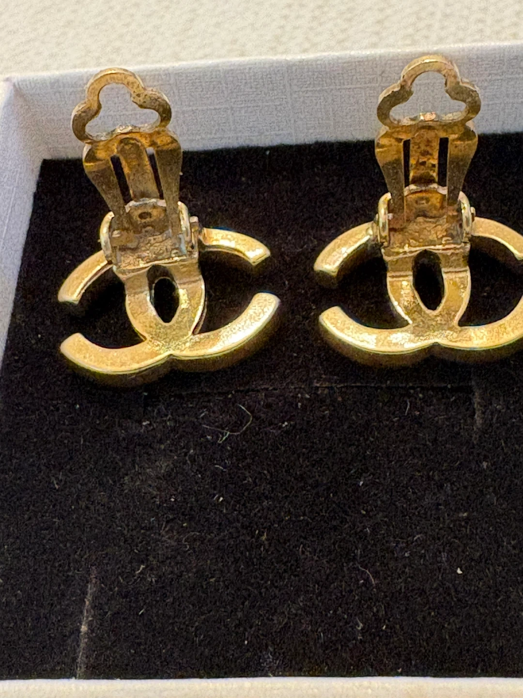 These are vintage Chanel clip-on earrings featuring the iconic CC logo. The hardware is gold-tone metal. They're designed for pierced ears, offering a classic statement piece. A great addition to any accessory collection!