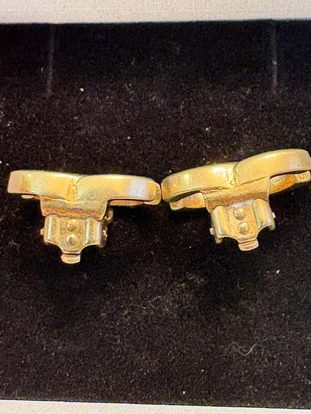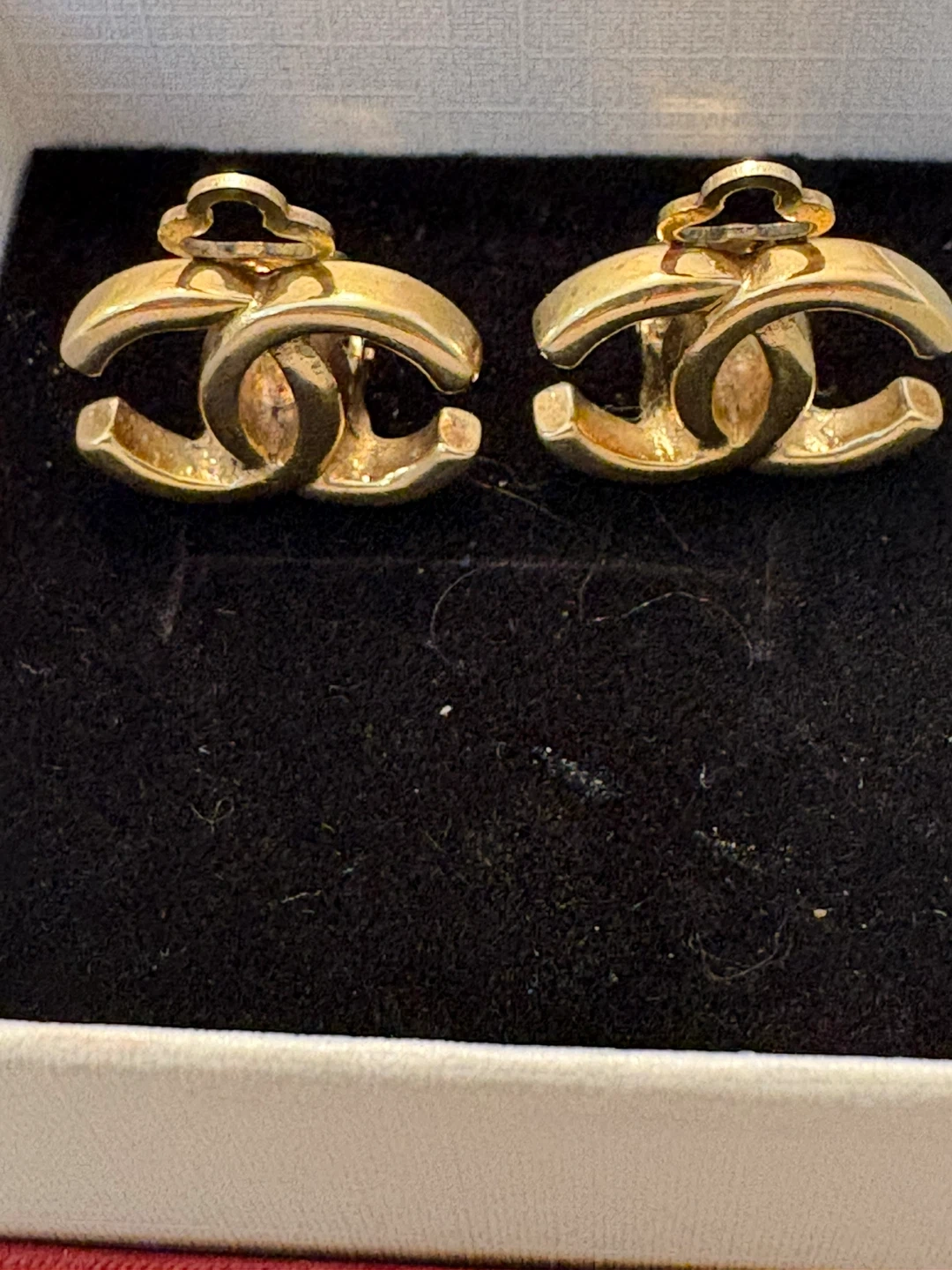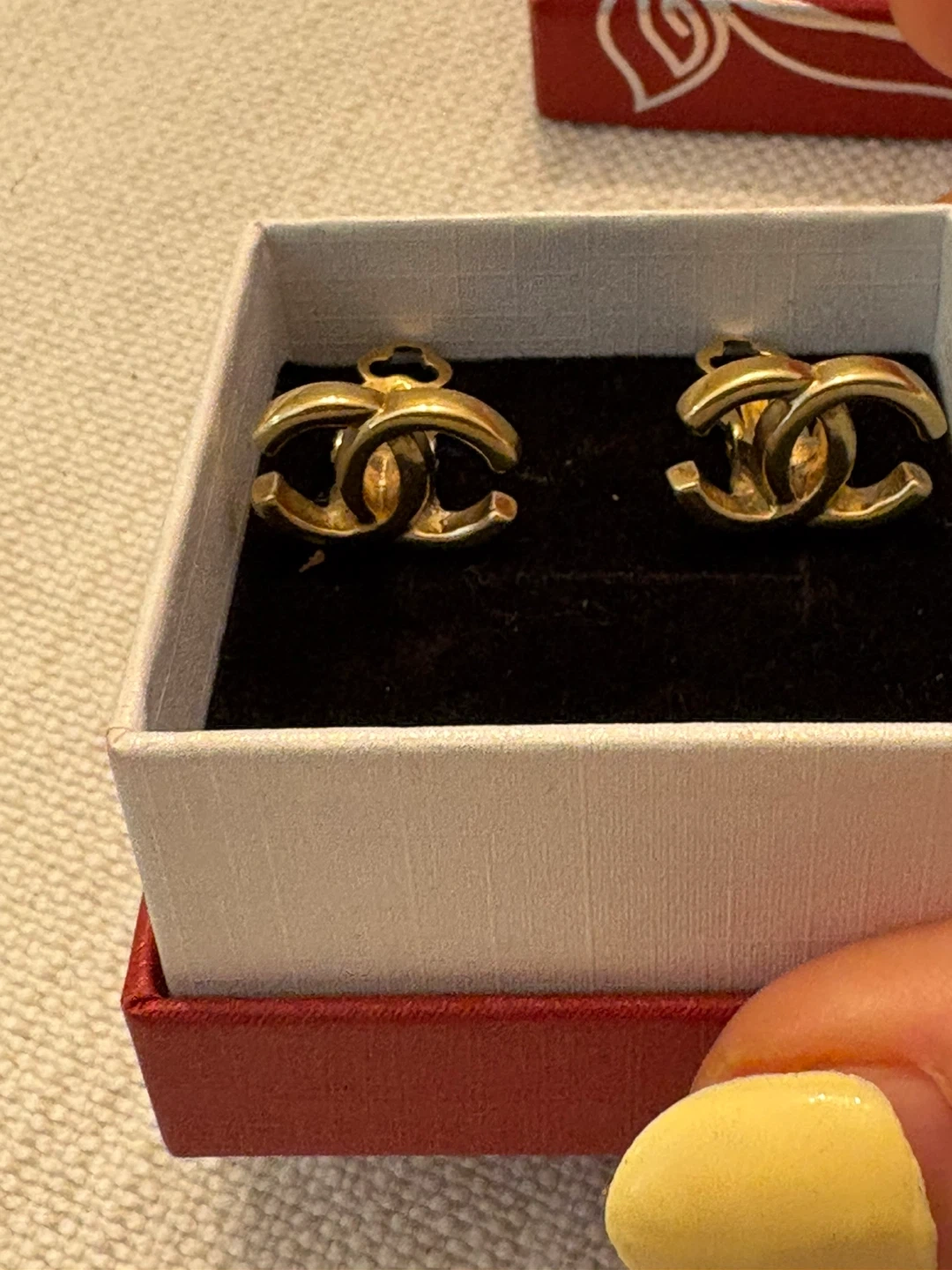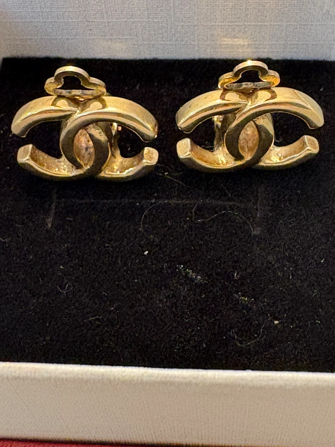These are vintage Chanel clip-on earrings featuring the iconic CC logo. The hardware is gold-tone metal. They're designed for pierced ears, offering a classic statement piece. A great addition to any accessory collection!
