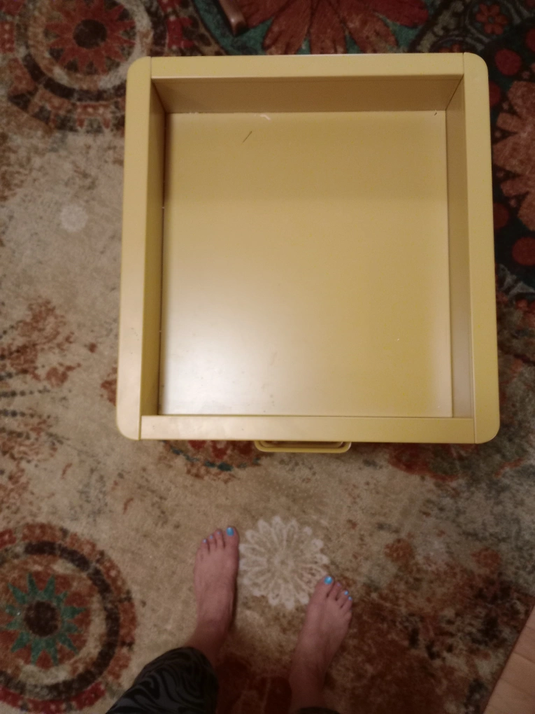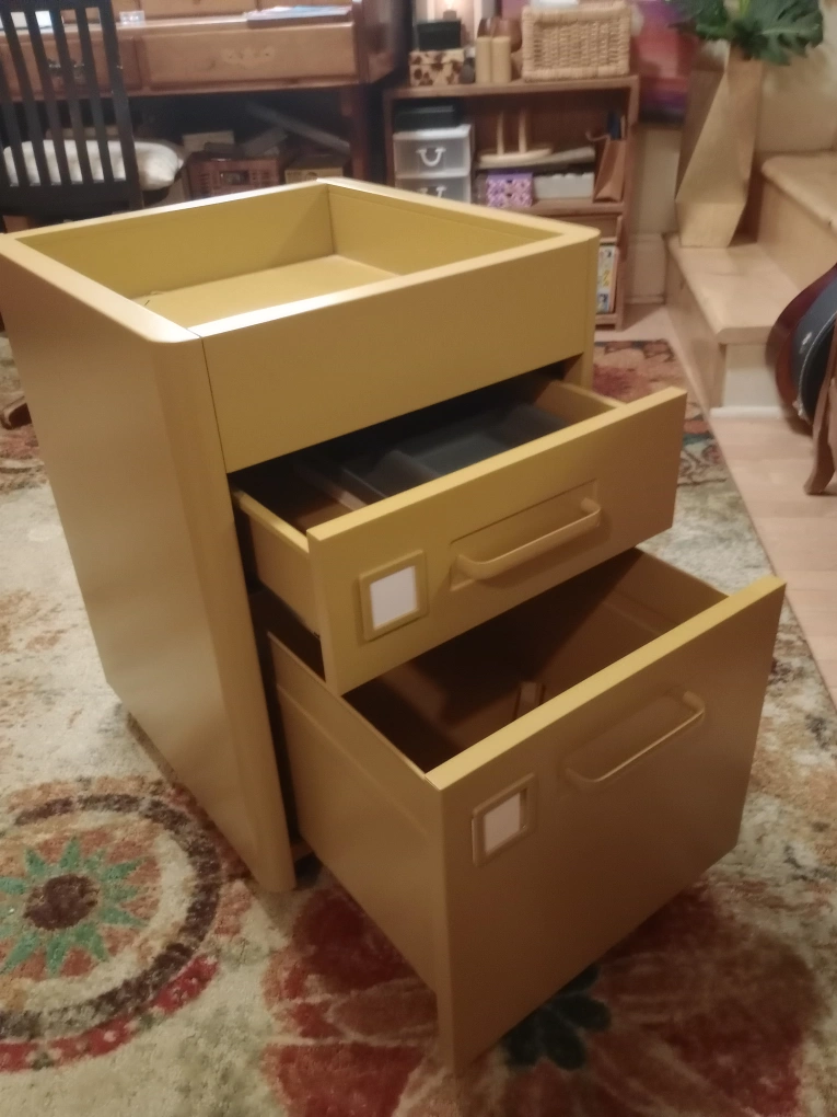 A mustard yellow metal filing cabinet with two drawers and wheels. The top area has high sides so can be used for display or for working with small items. Great for crafting like beadwork or the like.