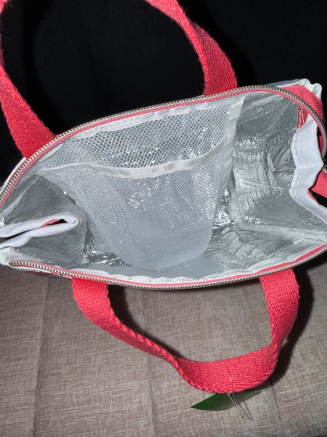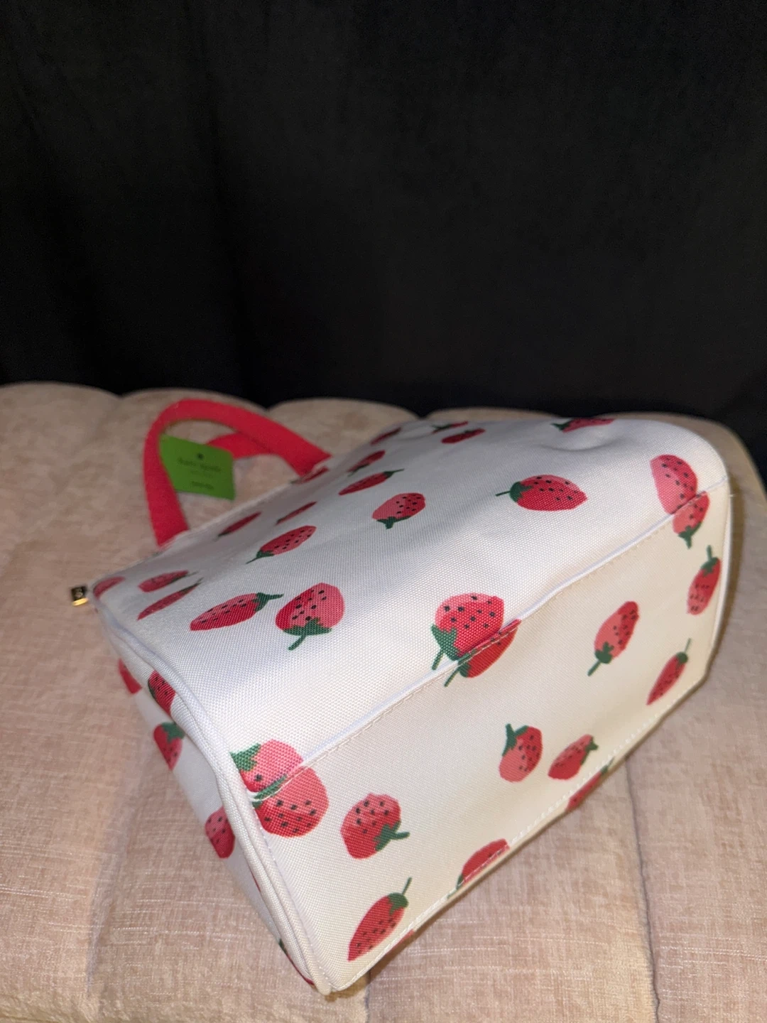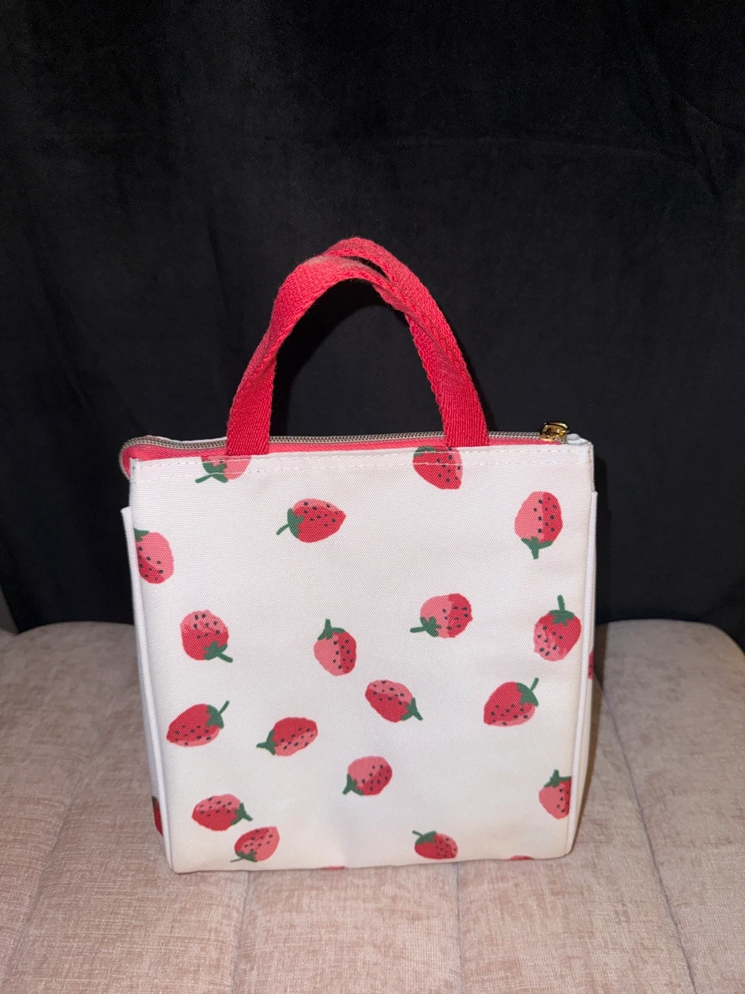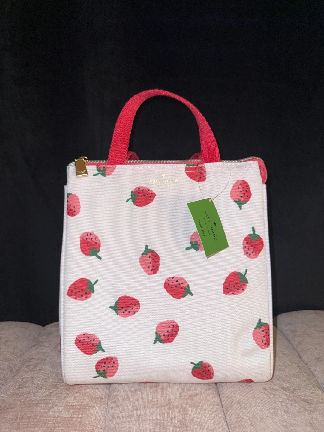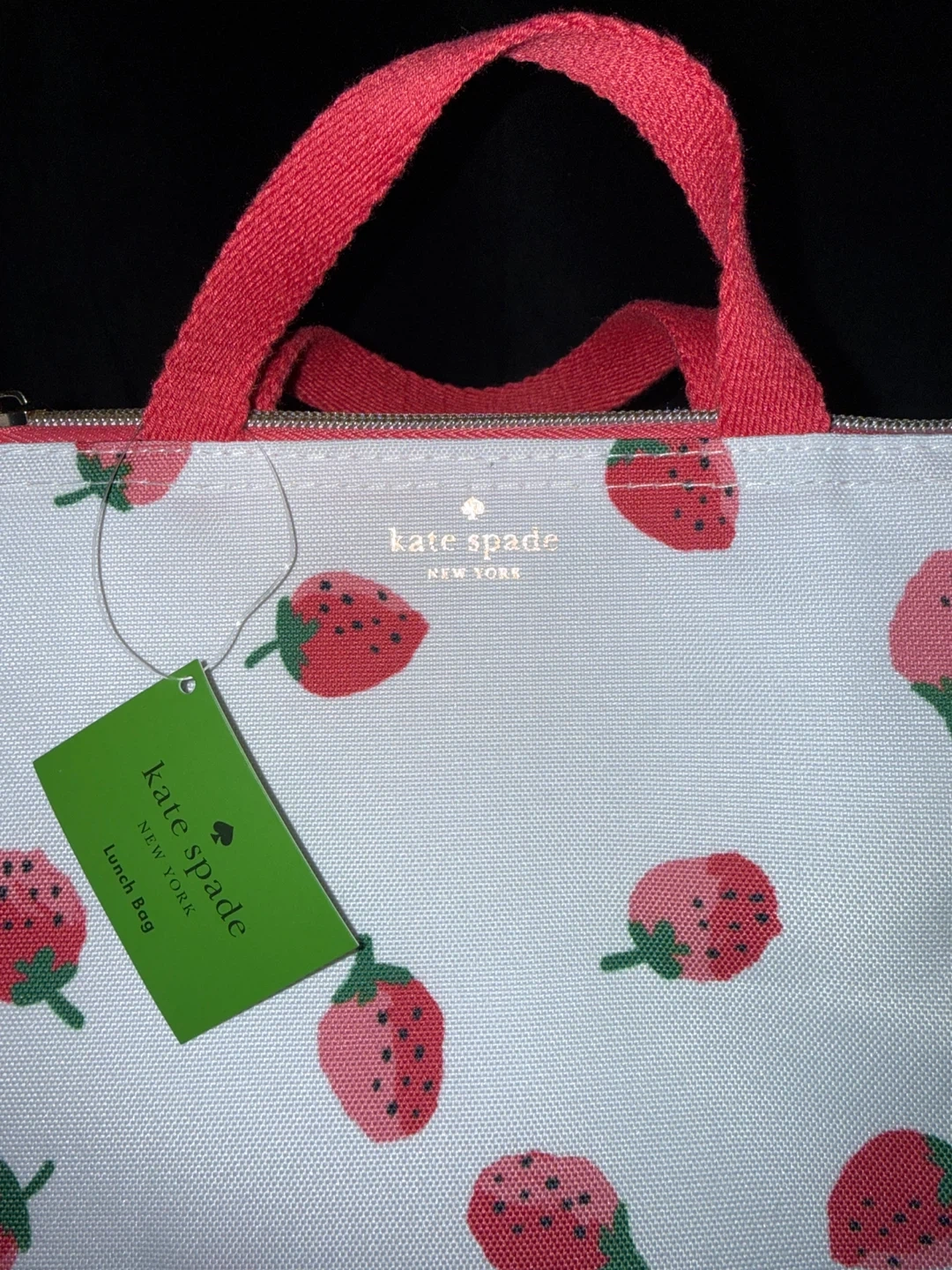 Kate Spade New York insulated lunch bag with a fun strawberry print. It features red fabric handles and a zip closure. Inside has mesh pockets for organization. New and unused with tag still on.