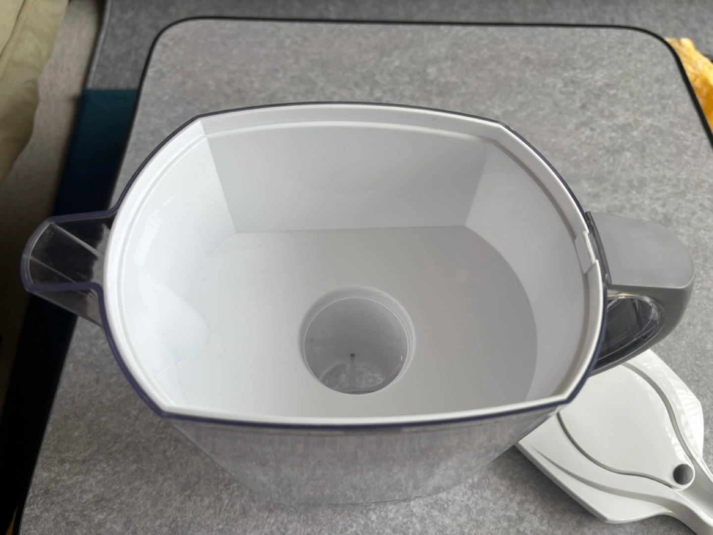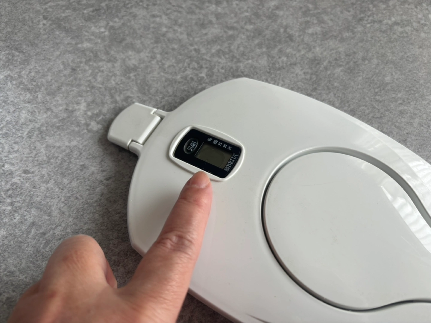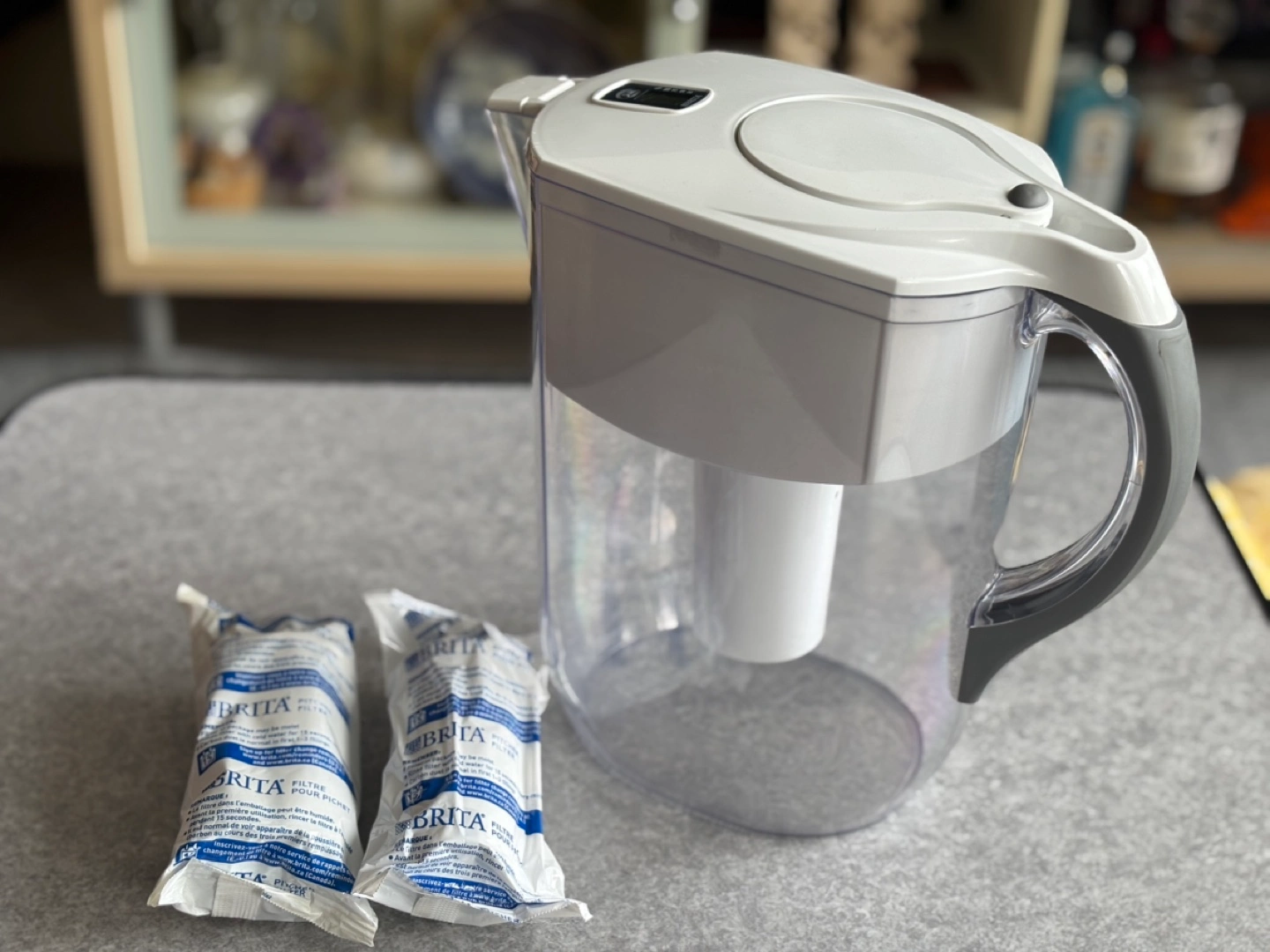 Brita water filter pitcher. Includes two replacement filters. Minor surface scratches. Digital filter indicator doesn’t work.