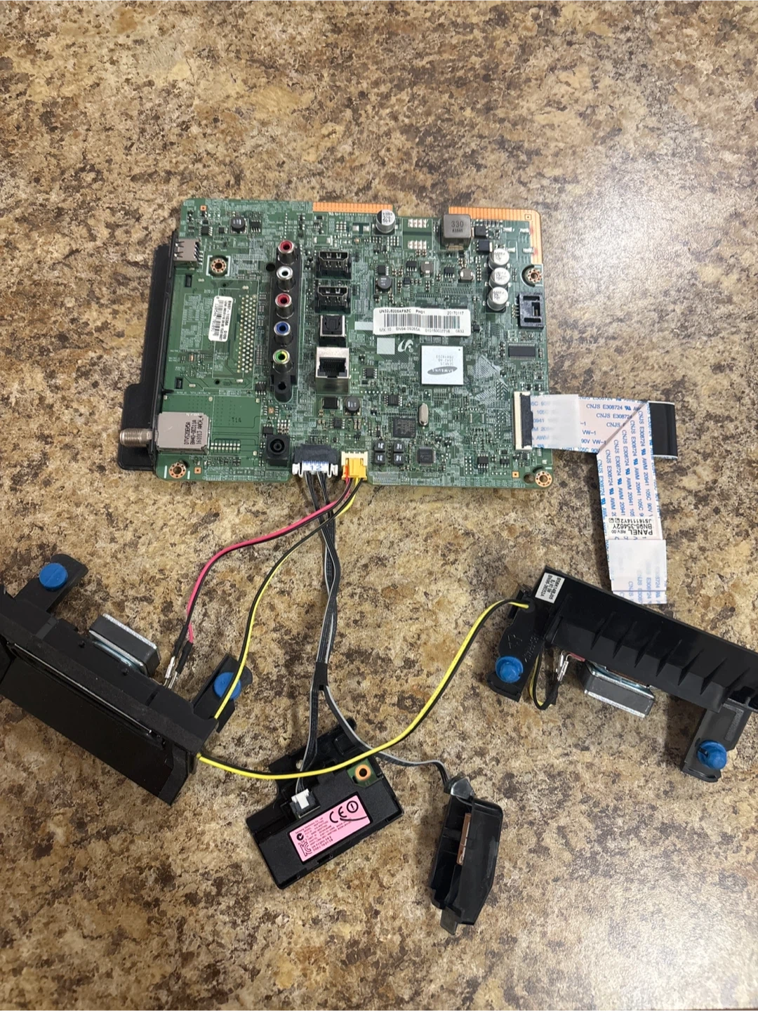 Samsung TV main board with speakers. The board has multiple input/output ports including HDMI. It's part of a TV repair or replacement project. Includes all visible cables and components.