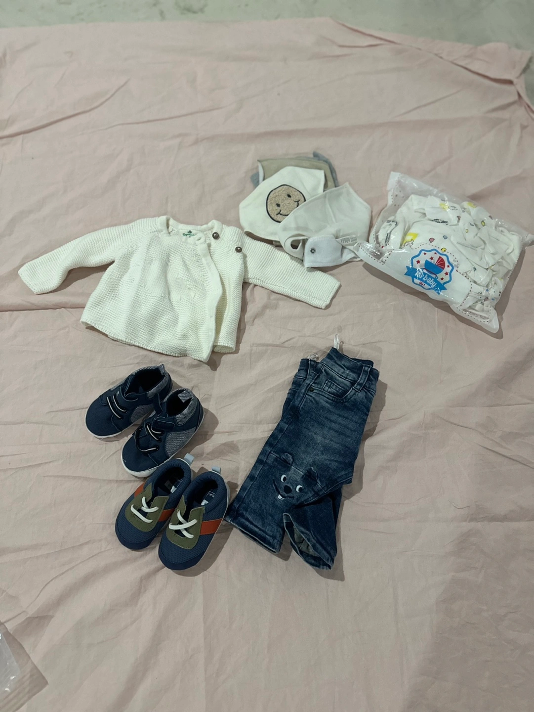 A bundle of baby boy clothes, including a sweater, jeans, shoes, and bib. The sweater is white with a button closure. The jeans are blue denim with a bear design. The shoes are blue with white laces. The bib is white with a yellow smiley face. All are in great condition.