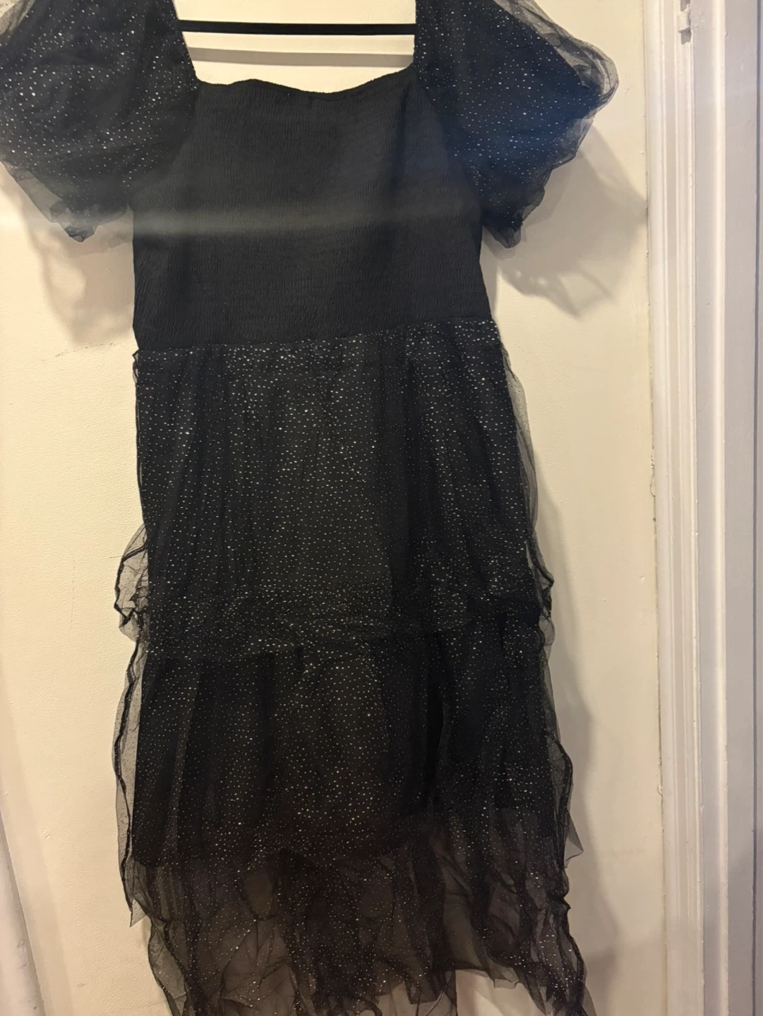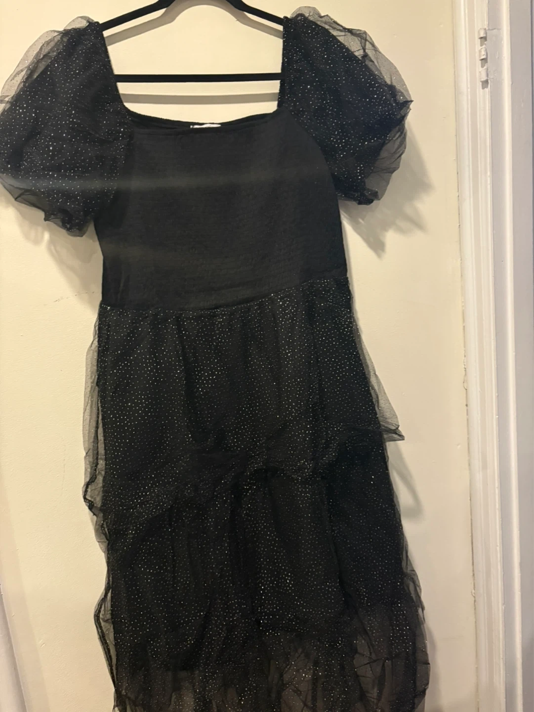 This black Youtalia dress has a sparkly tulle overlay and puffed sleeves. It's a size XXL. It’s comfortable and super cute !