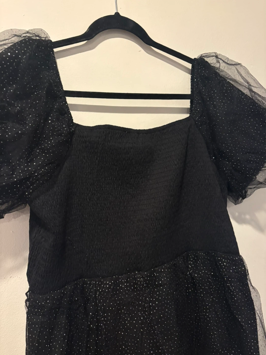 This black Youtalia dress has a sparkly tulle overlay and puffed sleeves. It's a size XXL. It’s comfortable and super cute !