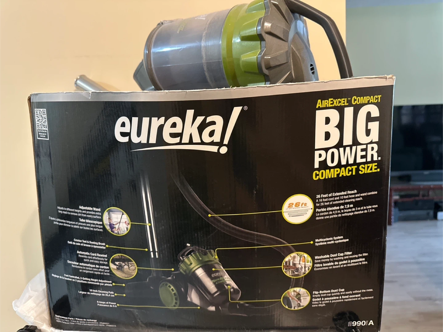 224Selling a Eureka AirExcel Compact vacuum cleaner! It's a bagless canister type. Features include bare floor and corner cleaning, a 26 ft reach, and a flip-bottom dust cup for easy emptying