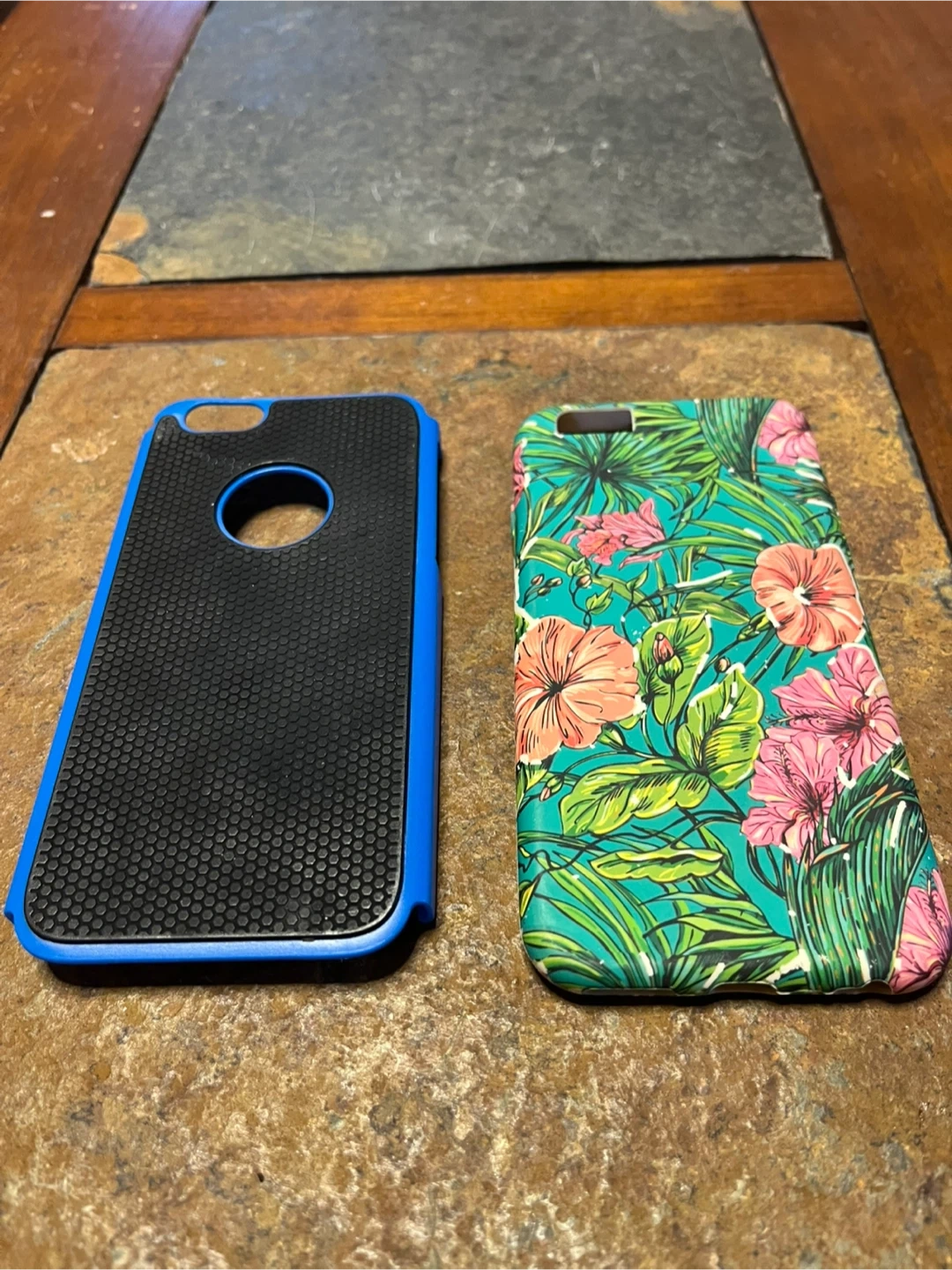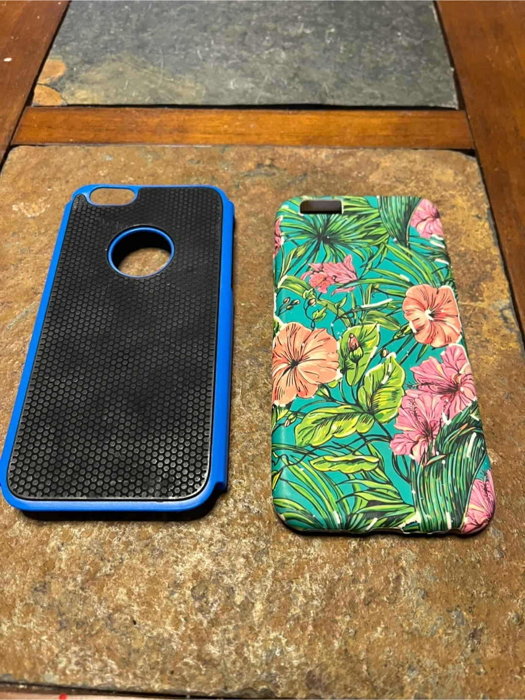 Selling two phone cases for an iPhone 6 or 6s. One is a vibrant floral design, and the other is a blue and black case with a textured back. Both are in great condition and ready to protect your phone!
