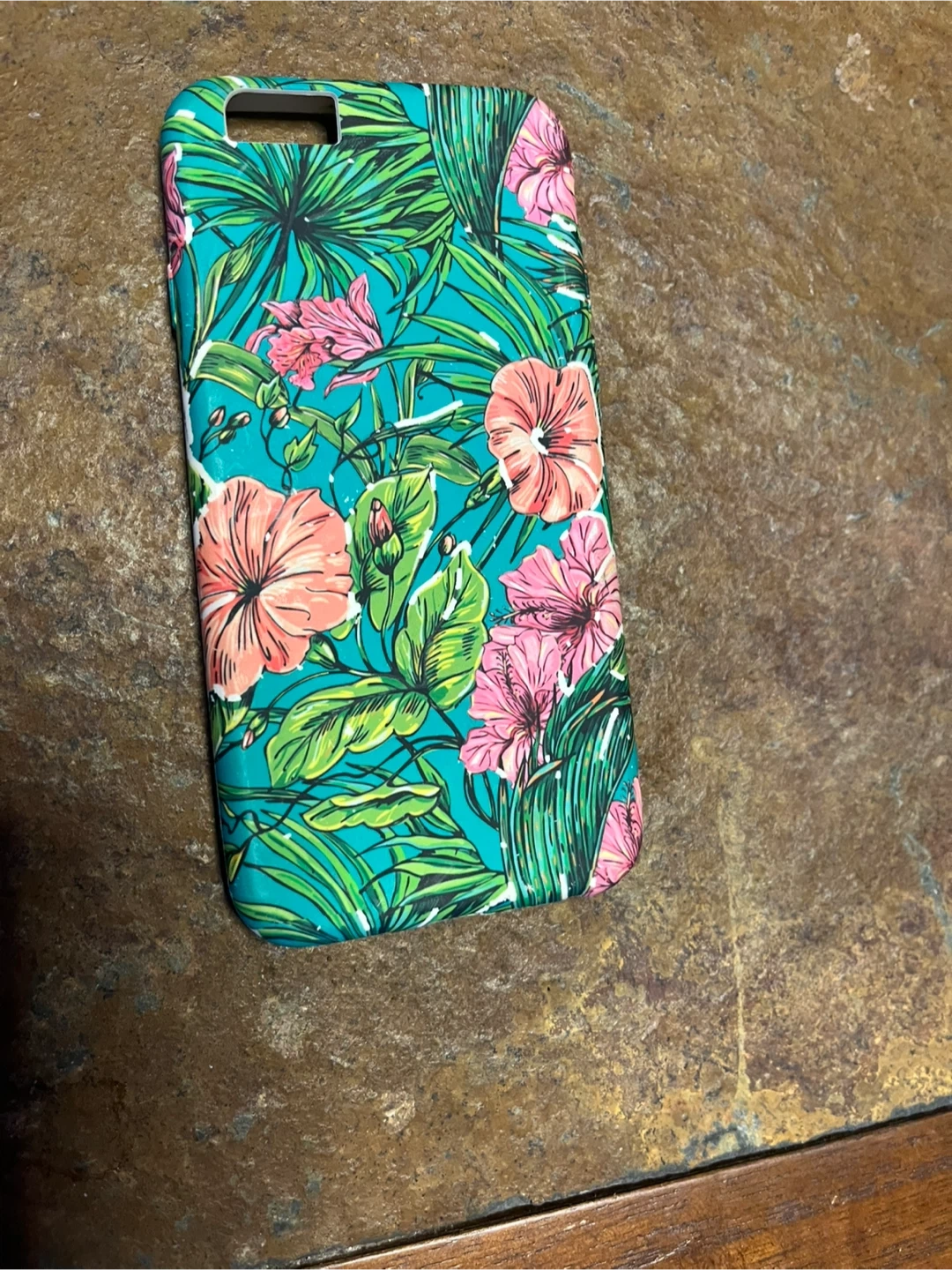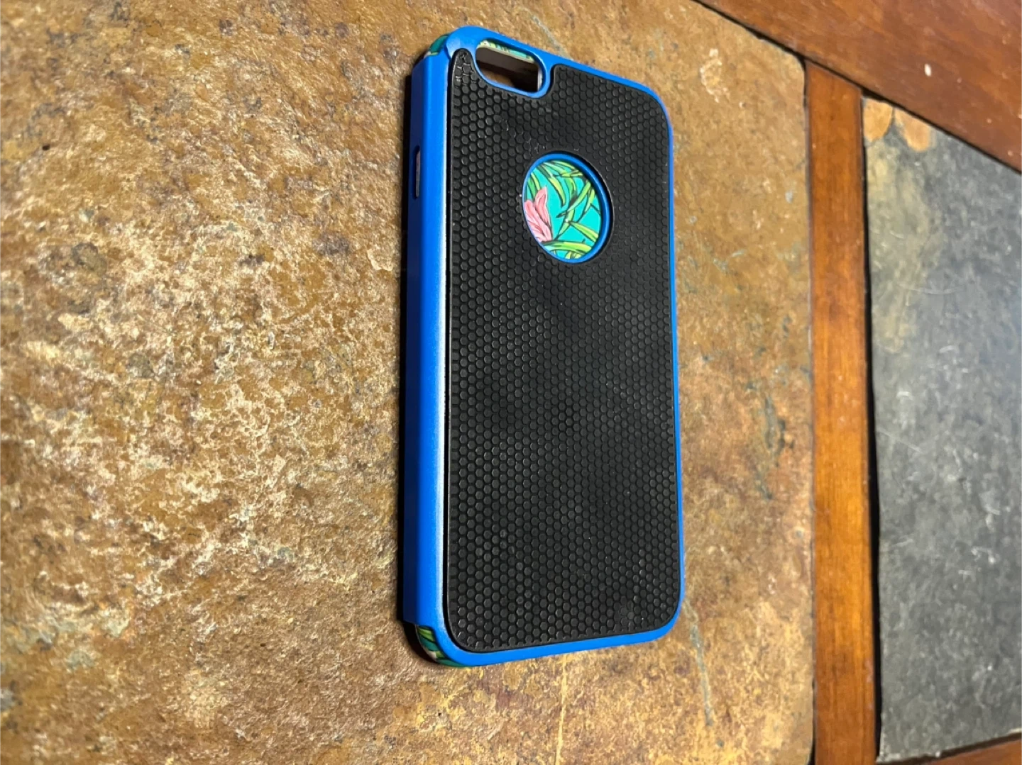 Selling two phone cases for an iPhone 6 or 6s. One is a vibrant floral design, and the other is a blue and black case with a textured back. Both are in great condition and ready to protect your phone!