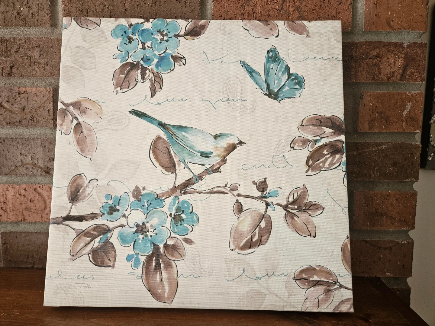 This lovely canvas art piece features a watercolour-style design with blue birds, butterflies, and floral elements on a cream background. It's a nice addition to your home decor. Measures approximately 12x12 inches.