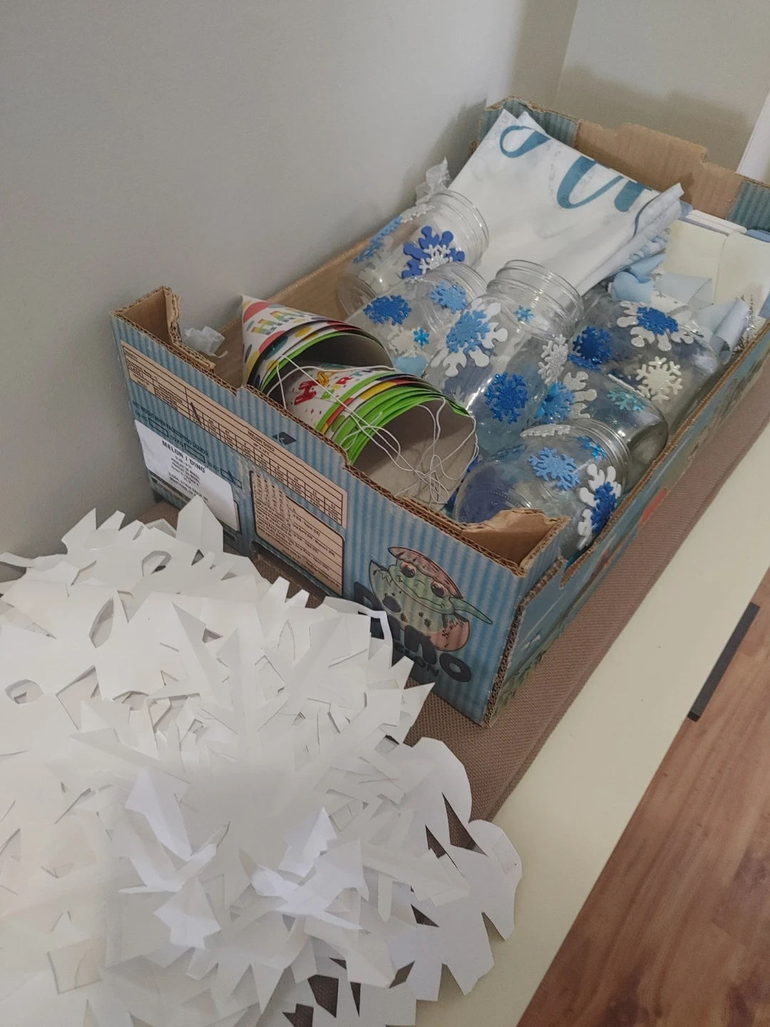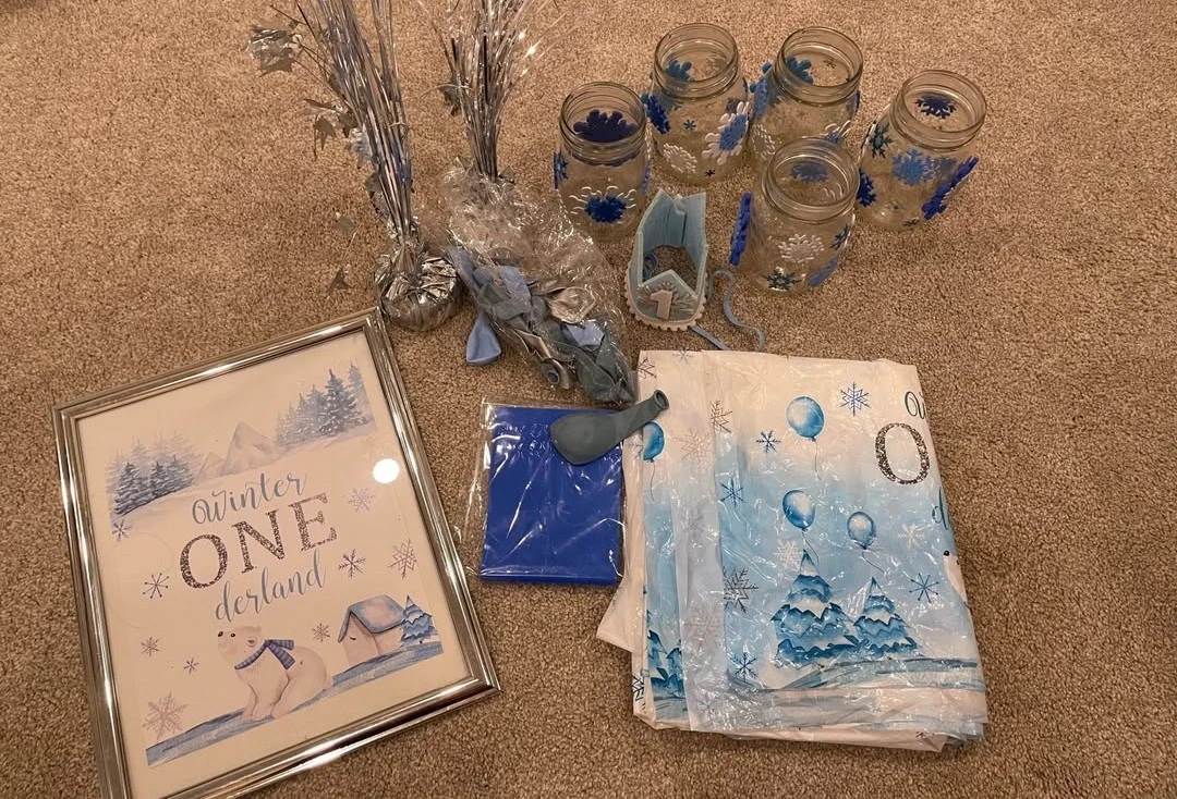 This set includes a "Winter Onederland" backdrop, a framed picture, decorative jars, large decorative blocks spelling "ONE", and assorted winter-themed party decorations, party hats, plates, napkins, and straws. It's perfect for a little one's first birthday celebration with a snowy theme!