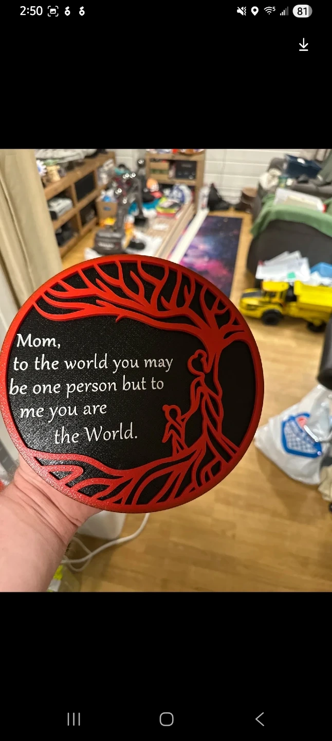 Decorative plaque with a touching quote for Mom. It features a tree and figures, and the text reads "Mom, to the world you may be one person but to me you are the World." This would make a thoughtful gift for any mother!