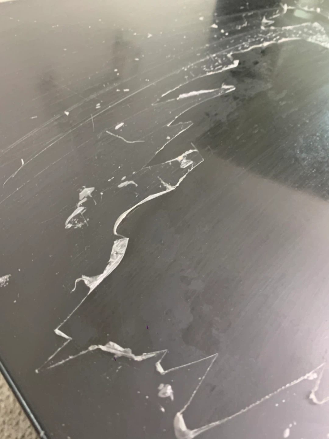 There is a thin plastic covering that’s peeling and the bottom drawer is missing (see photos)