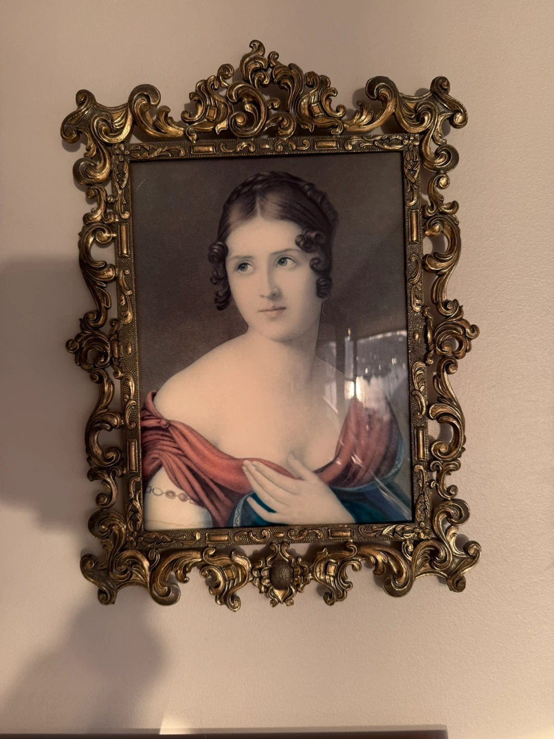 This vintage framed portrait painting depicts a woman with curled hair and a red draped gown. The frame is ornate and gold-gilt. It's a lovely decorative piece for any room.