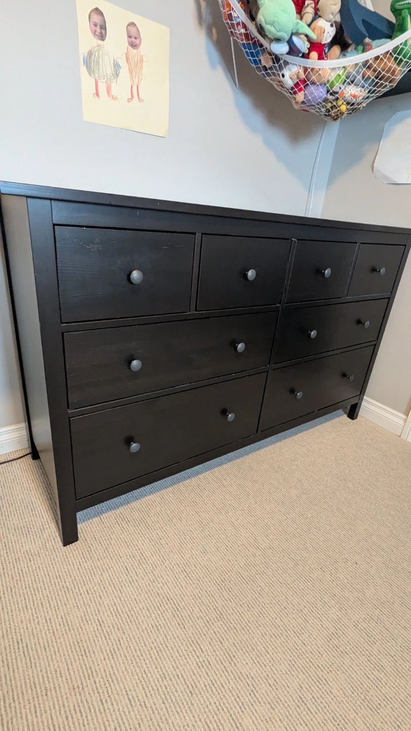 This is a black dresser with seven drawers. It has two rows of drawers; the top row has four smaller drawers, and the bottom row has three larger drawers. It's perfect for organizing clothes or other bedroom items.