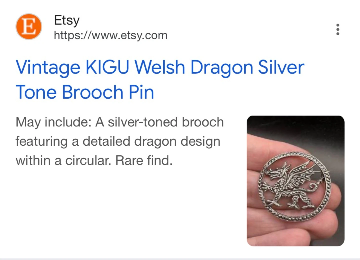 This is a vintage KIGU silver-tone brooch pin. It features a detailed dragon design within a circular frame. A unique accessory for any collection!