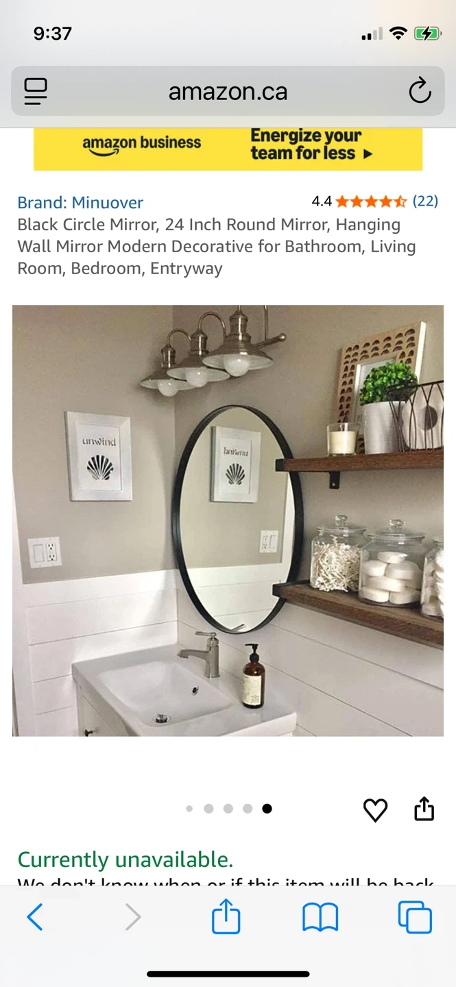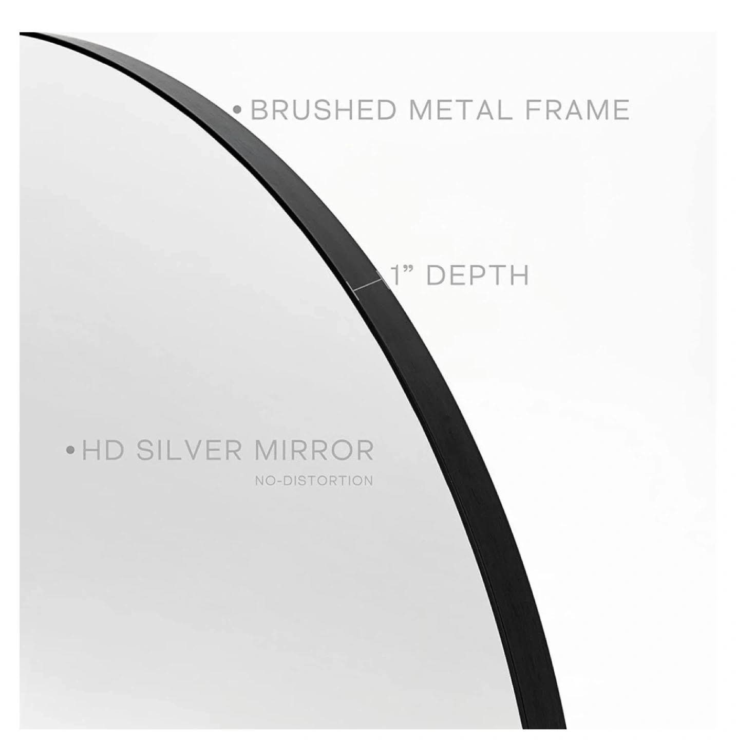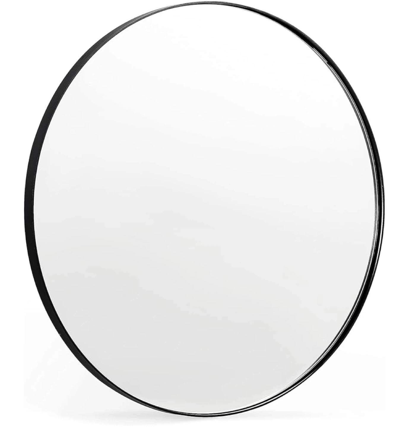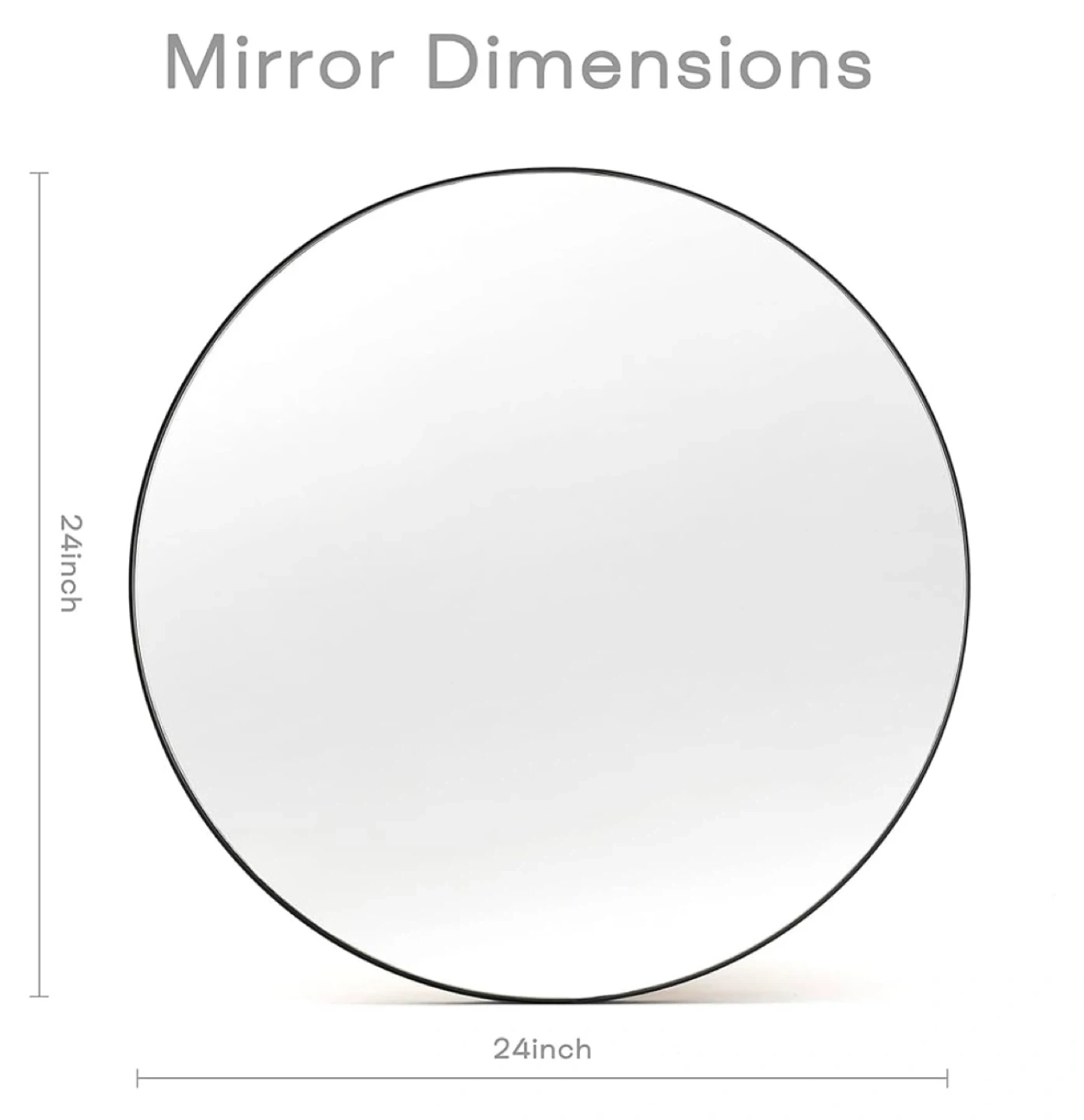 This 24-inch round mirror features a sleek black brushed metal frame. It's an HD silver mirror with no distortion and a 0.24" depth. The recessed design floats the glass within the frame, surrounded by a 1/12" gap.