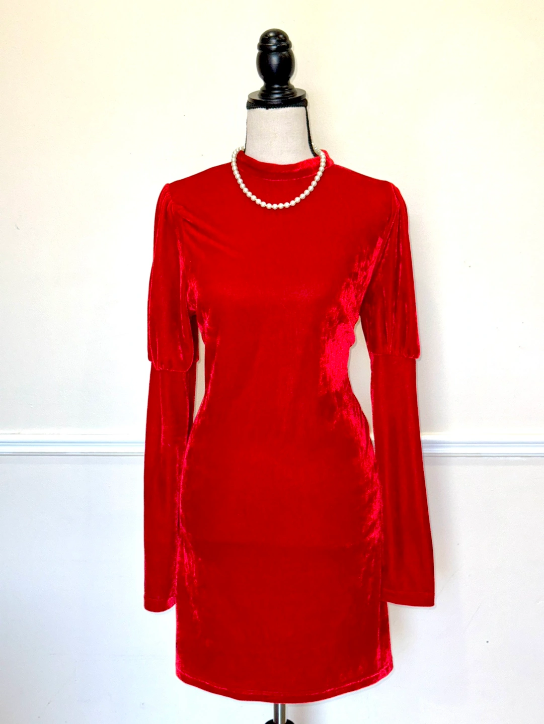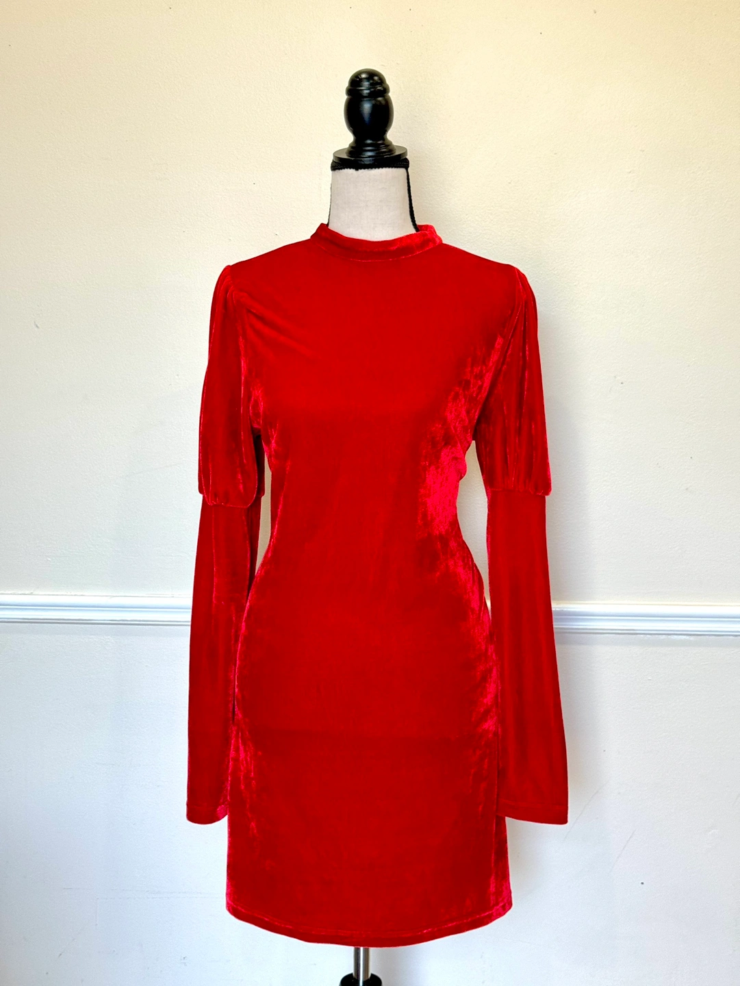 A red velvet mini dress with long sleeves. The dress has a mock neck and a fitted silhouette. It is perfect for a night out or a special occasion.