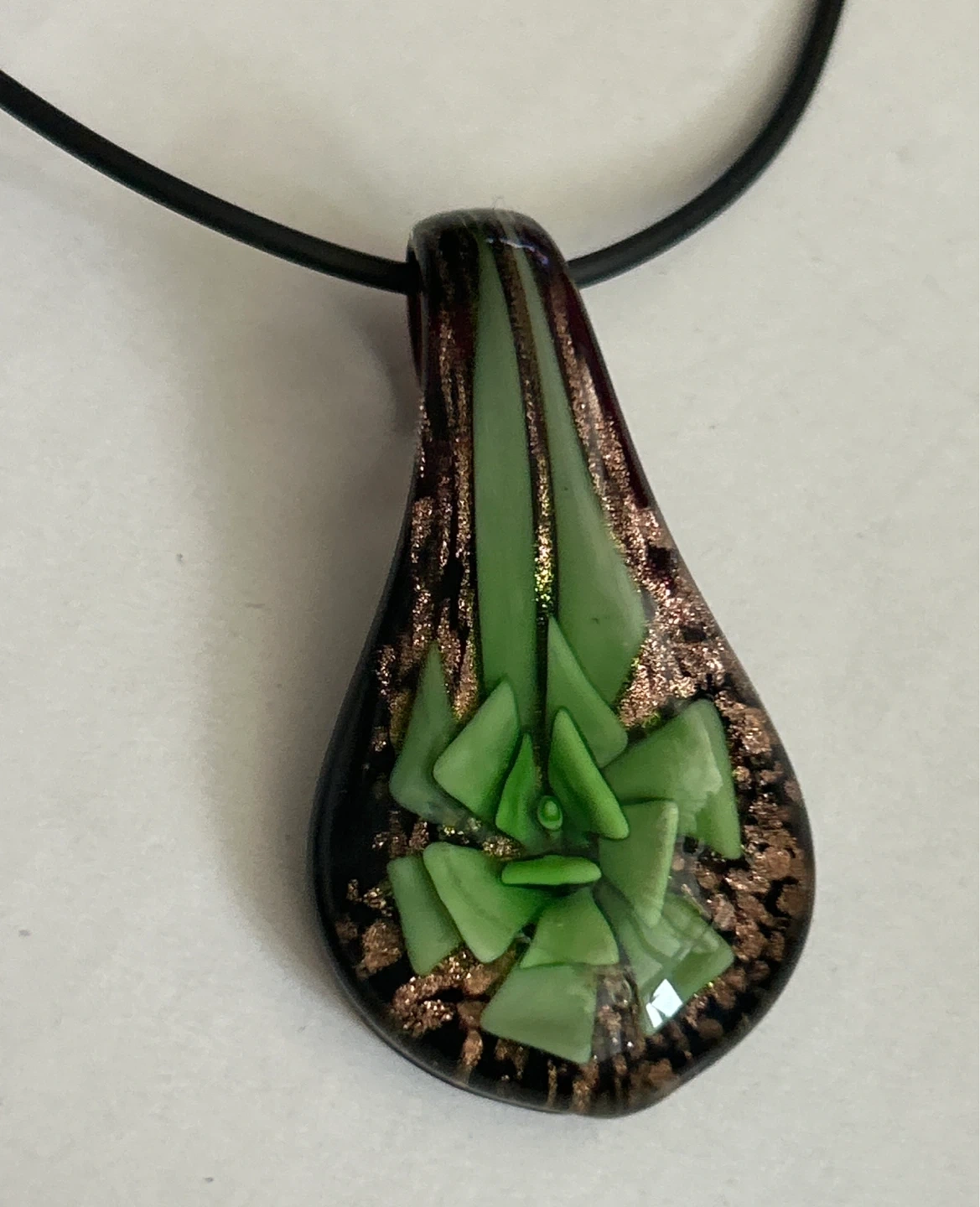 This unique necklace features a teardrop-shaped pendant crafted from blown glass. It showcases a vibrant green design accented with coppery flecks against a dark background. The pendant hangs on a black cord with a gold-tone clasp. It's a beautiful piece for adding a touch of colour!
