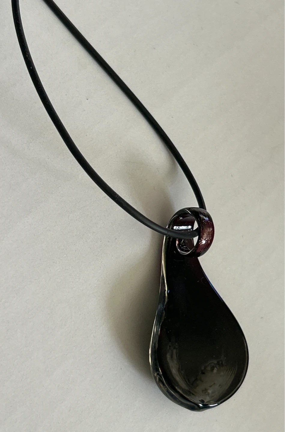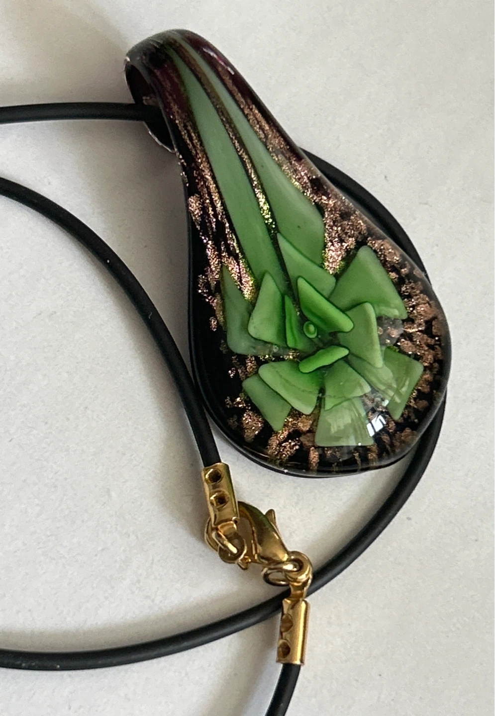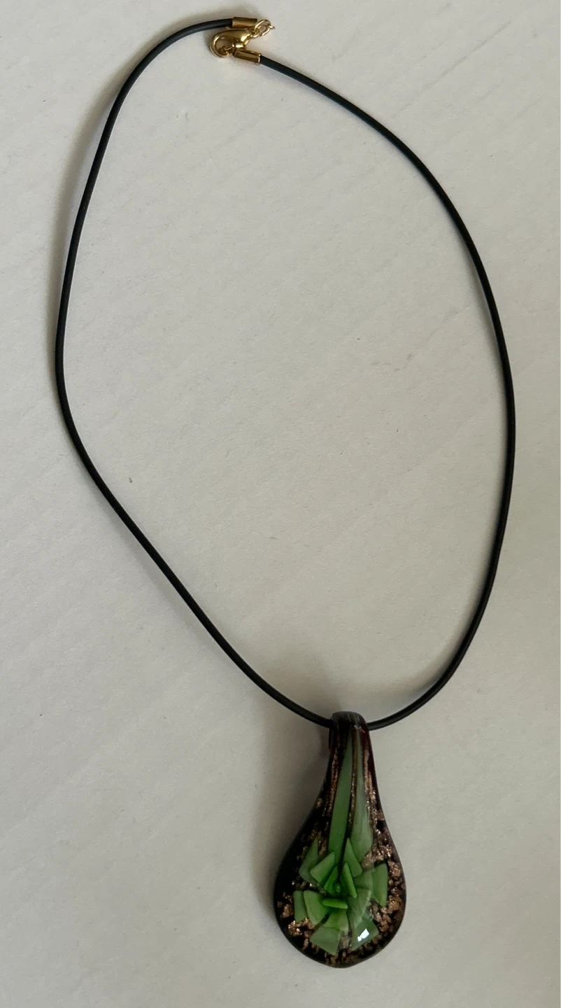 This unique necklace features a teardrop-shaped pendant crafted from blown glass. It showcases a vibrant green design accented with coppery flecks against a dark background. The pendant hangs on a black cord with a gold-tone clasp. It's a beautiful piece for adding a touch of colour!