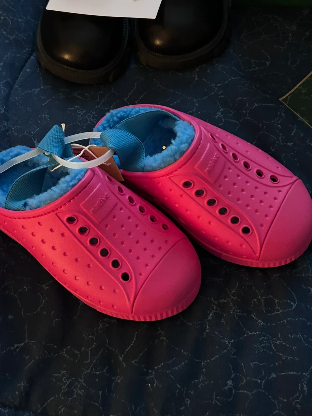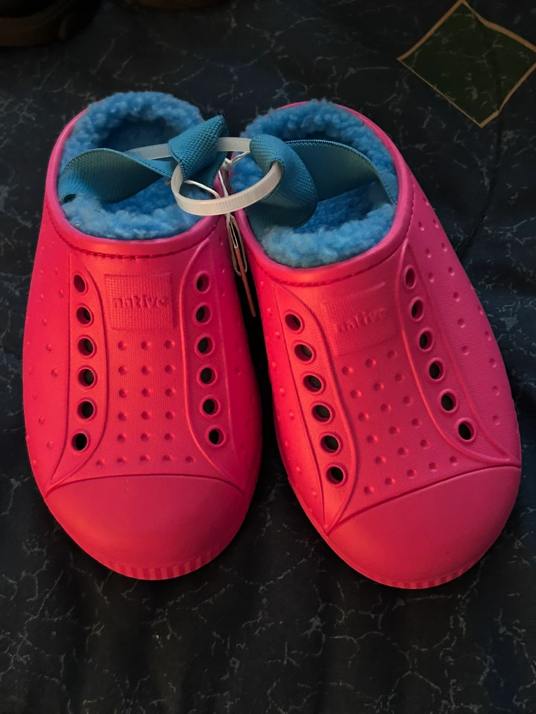 These Native Jefferson clogs are a bright pink colour with a cozy blue fleece lining. They're perfect for keeping little feet warm during cooler months. The material is lightweight and easy to clean.