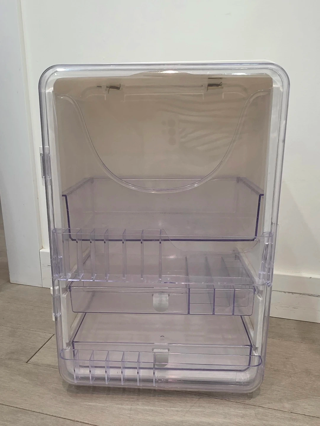 This clear plastic organizer has multiple compartments and drawers to store makeup and accessories. It's made of durable plastic. It includes a flip-top lid to keep items dust-free. This organizer is great for keeping your vanity tidy!