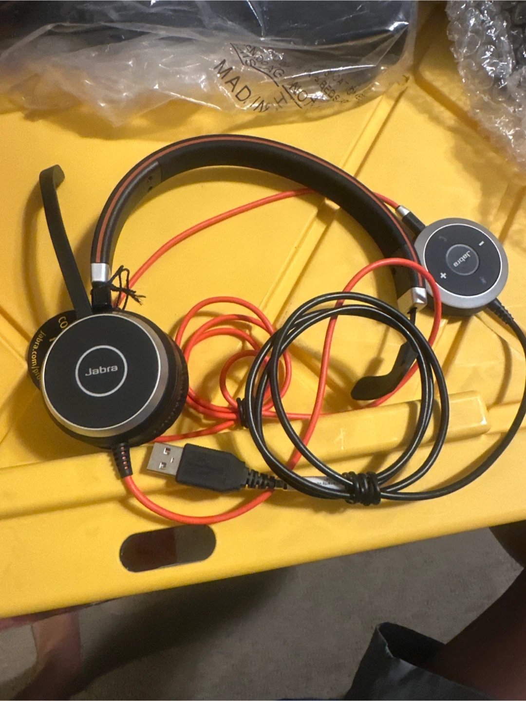 This is a Jabra Evolve 40 MS Stereo headset. It's designed for professional use and works with Microsoft Teams. The headset includes a USB controller and a microphone boom. It features a comfortable over-ear design for extended wear. Great for calls and collaboration!