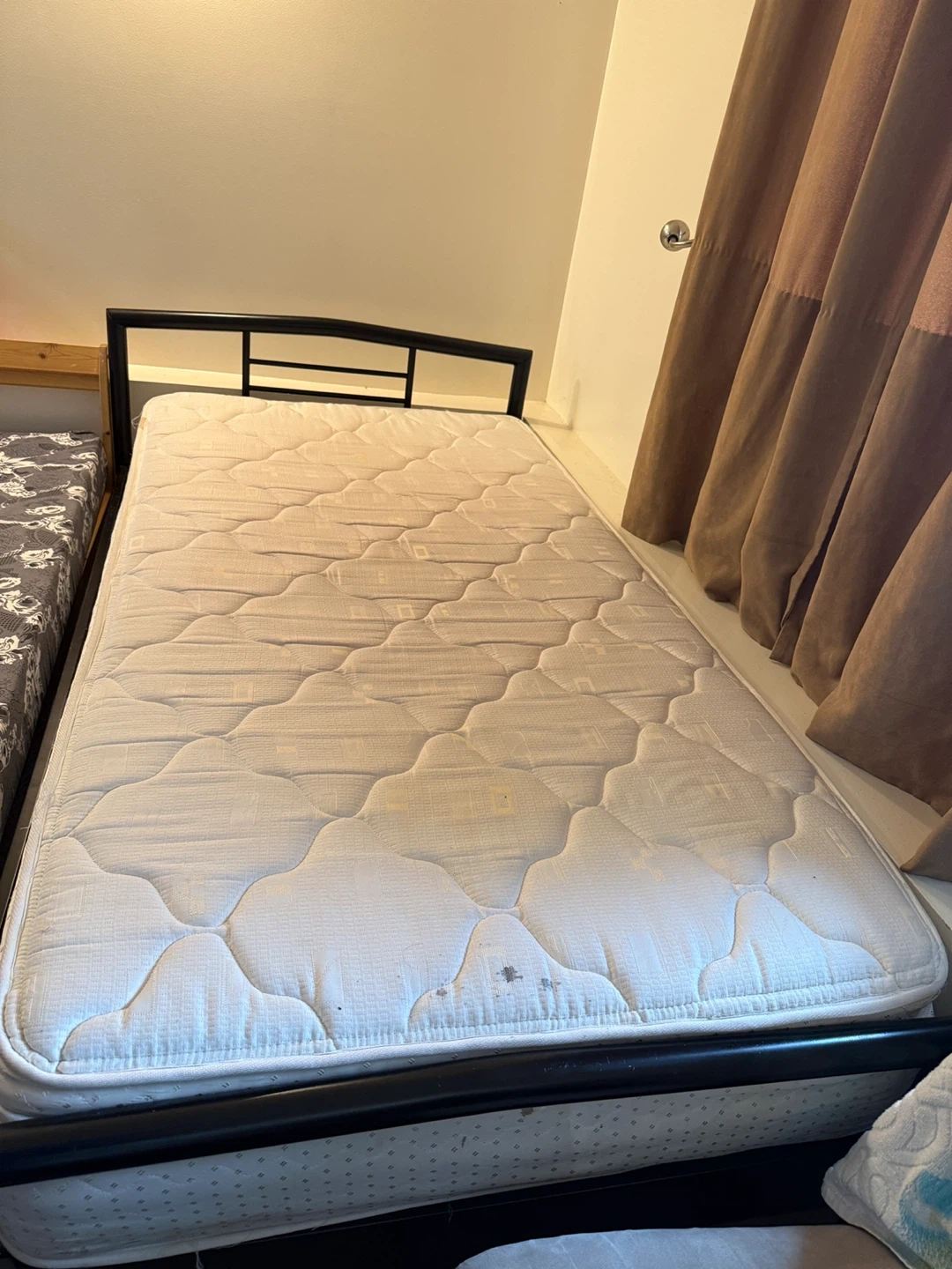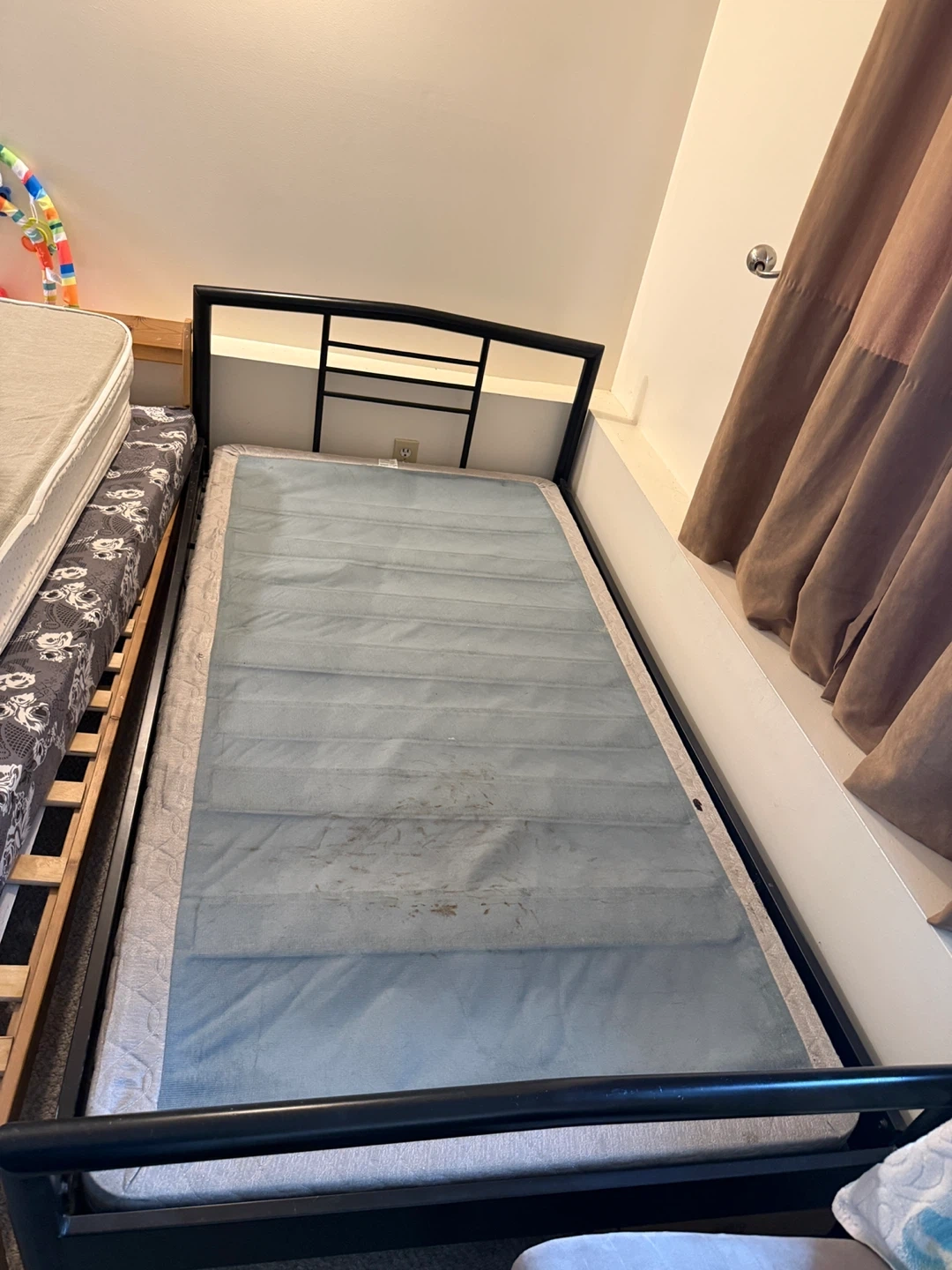 Sturdy bed frame available. Has black metal frame. Comes with a white mattress and a blue box spring.