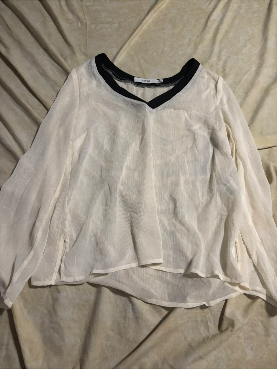 Sheer long-sleeve blouse from JUSTFAB. It's a size small with a black v-neck trim. Lightweight and flowy material.