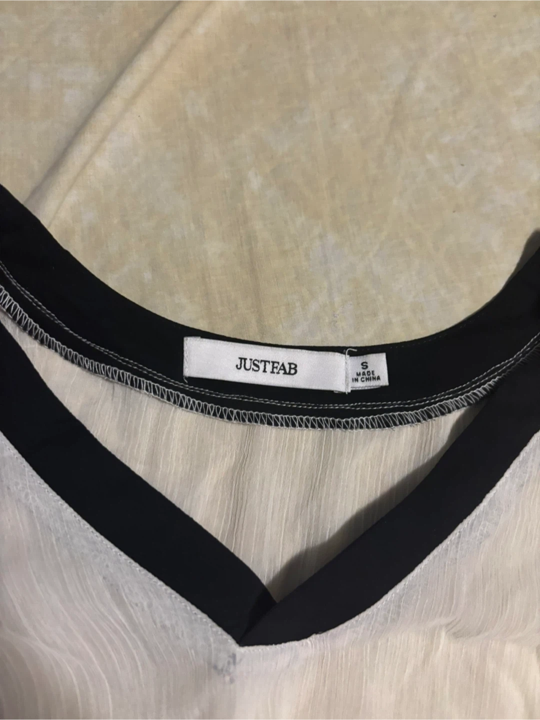 Sheer long-sleeve blouse from JUSTFAB. It's a size small with a black v-neck trim. Lightweight and flowy material.