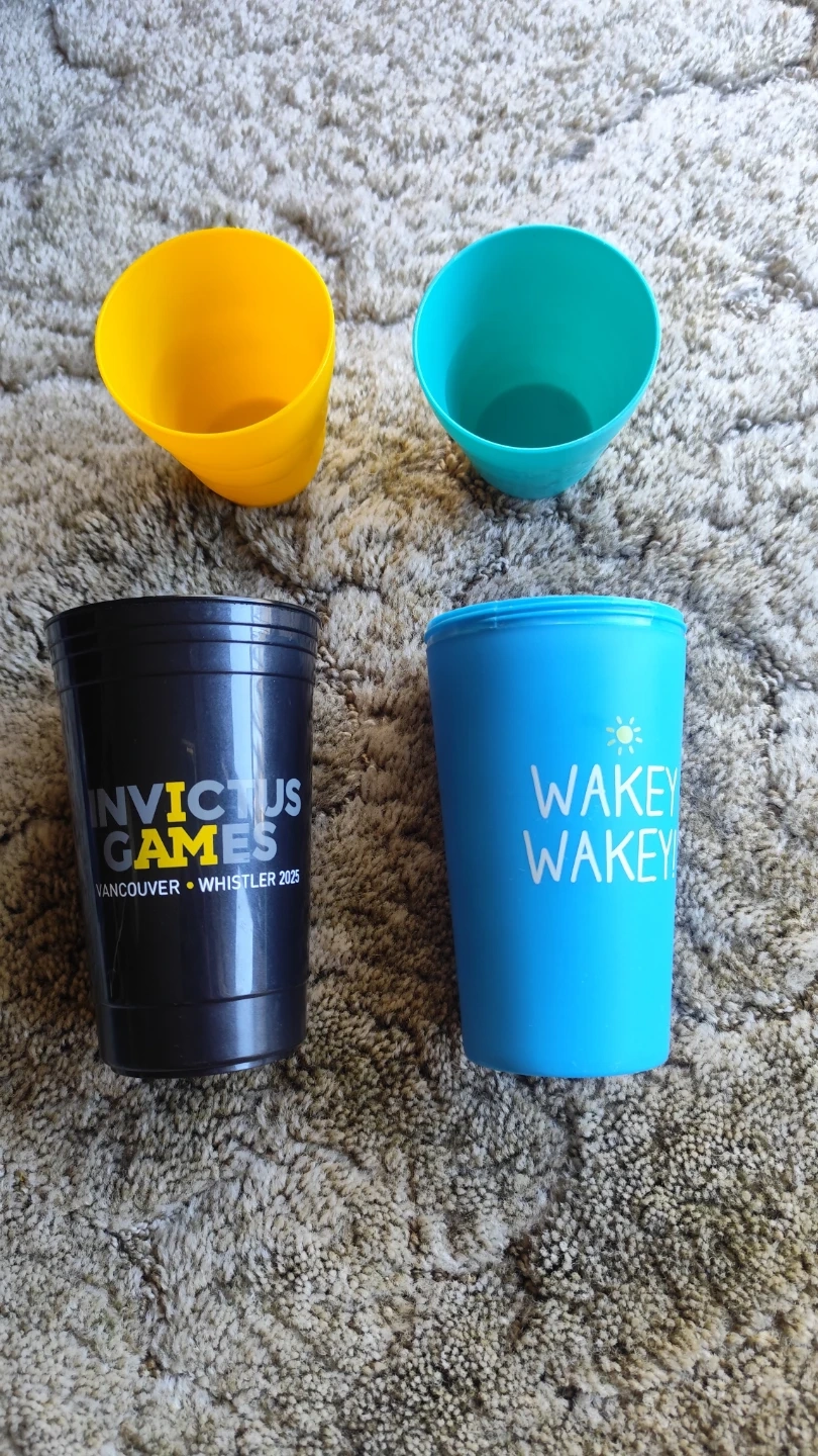 Four reusable cups: one black Invictus Games cup, one blue 'Wakey Wakey' cup, one yellow cup, and one teal cup. These are durable plastic cups.