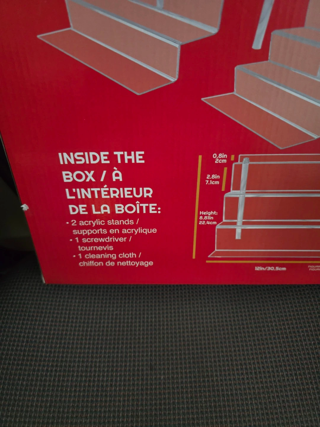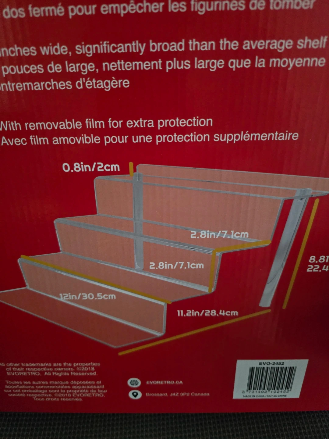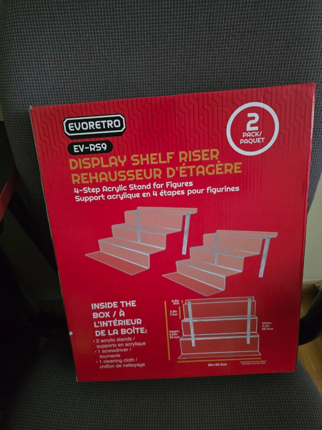 This is a 2-pack of EVORETRO 4-step acrylic display shelf risers. They're designed with an enclosed back to stop figures from falling. Includes a screwdriver and cleaning cloth for setup. The risers are 12 inches wide and come with a removable protective film.