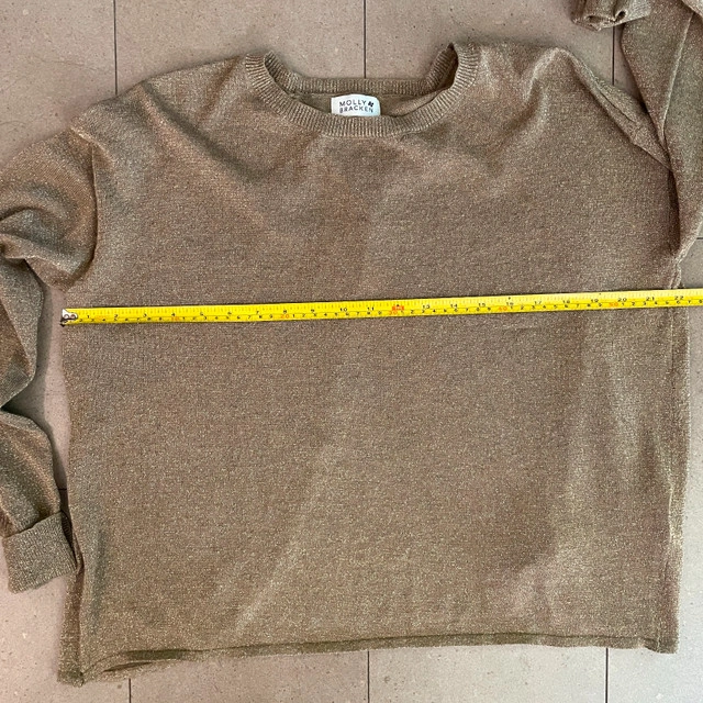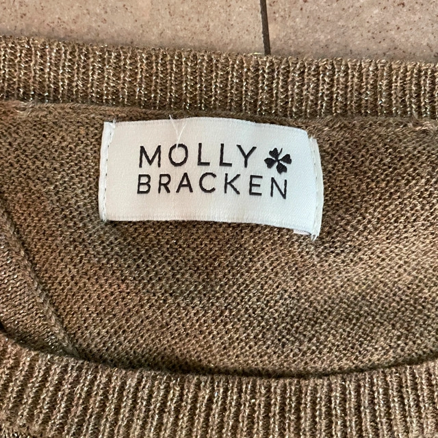 Selling a Stunning Molly Bracken with Metallic Gold Open Back knit sweater-Medium. Really soft cozy sweater. Round neckline. Crossed back and split in the middle. Ribbed neckline, cuff and bottom finish. Gently used. 54%polyester 20%polyamide 20%acrylic 6%wool Measurements lying flat: Pit to pit: 22" Length: 21.5" Asking $30 Available for pick up in the Broadview/Danforth area. Contact-free porch pick up. Check out my other great stuff!
