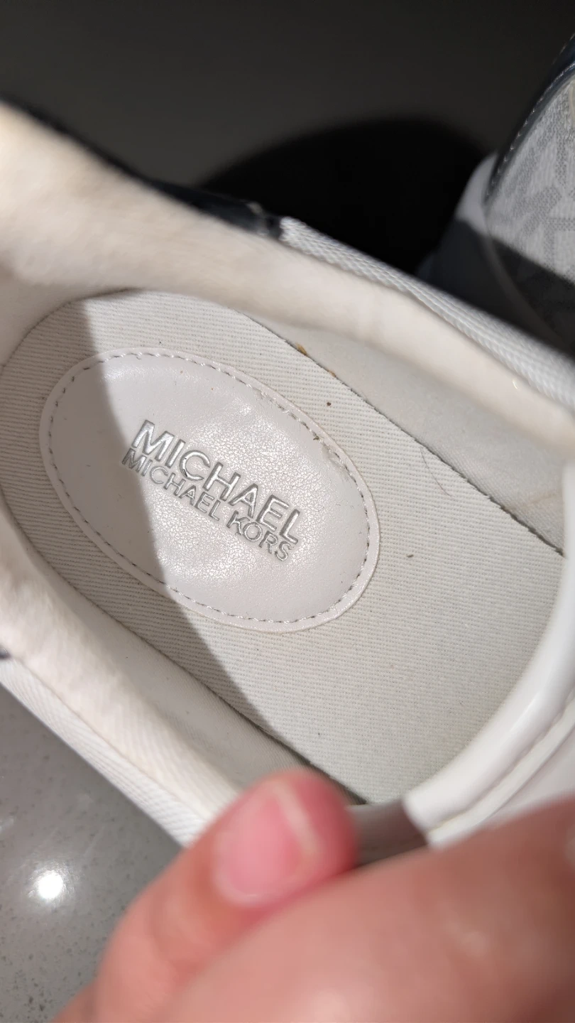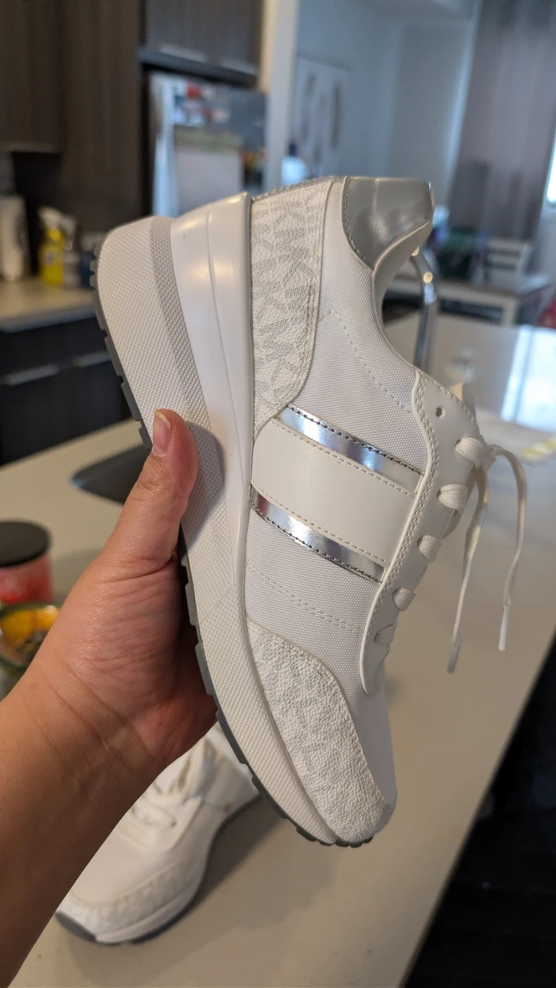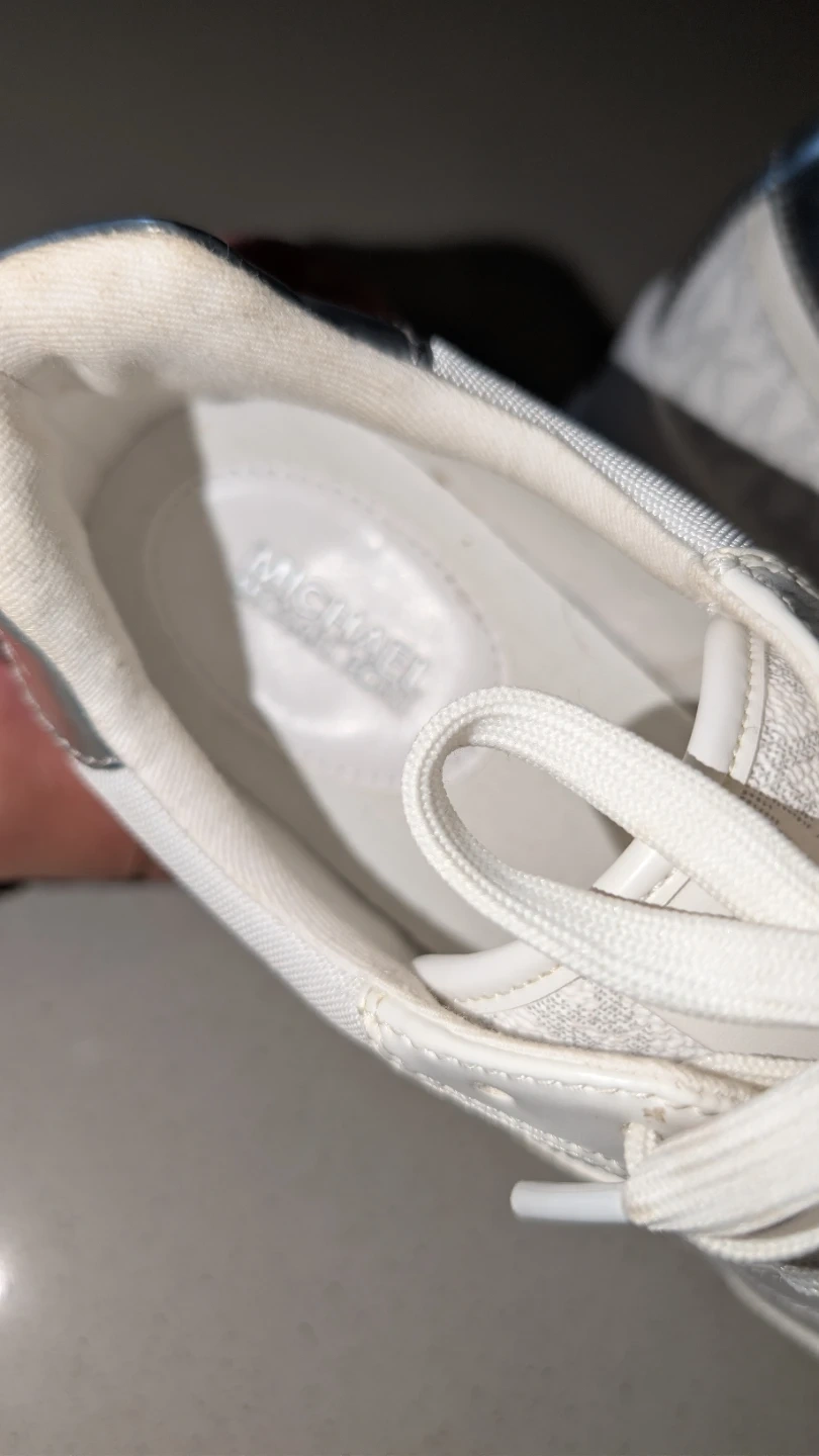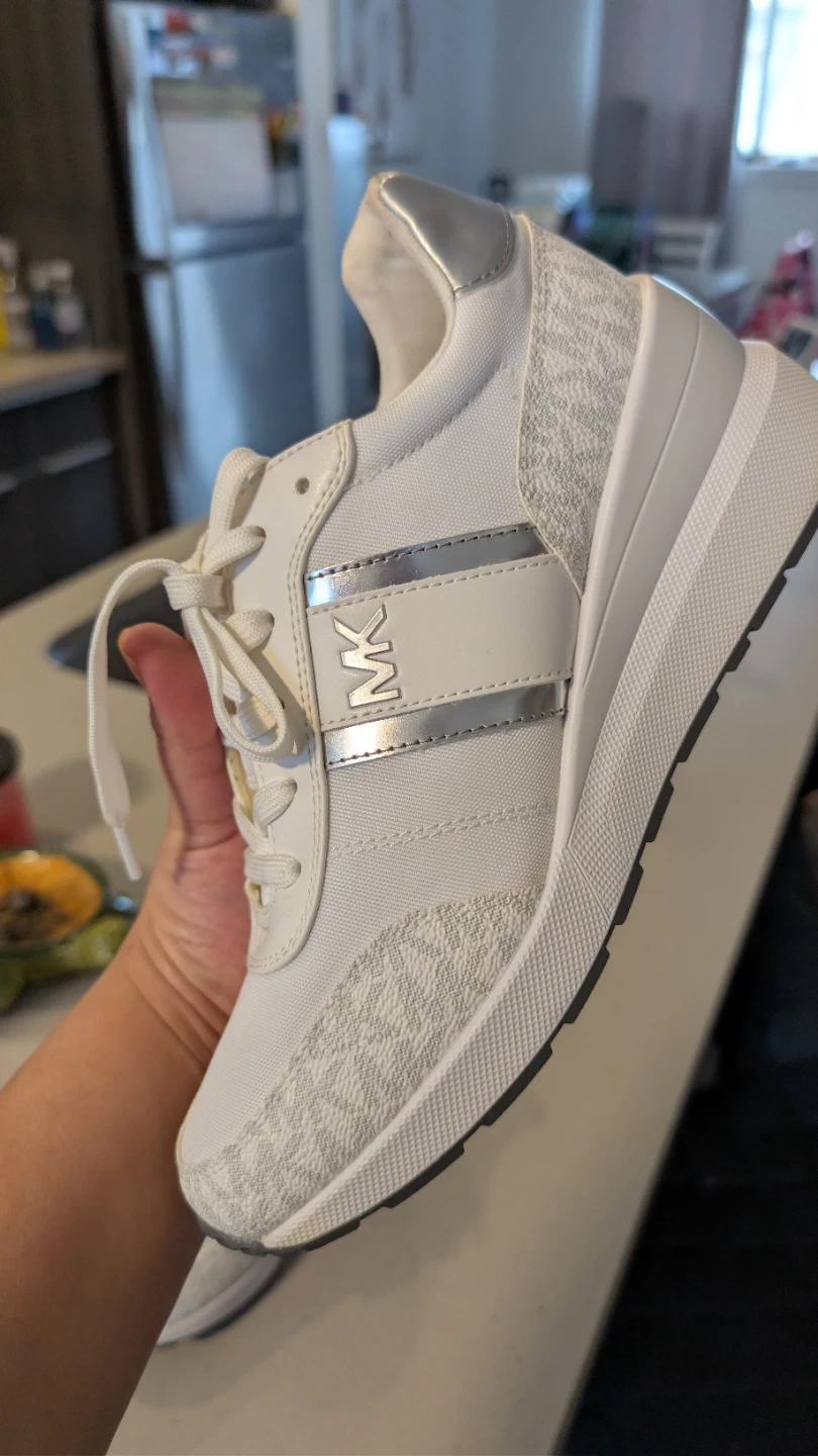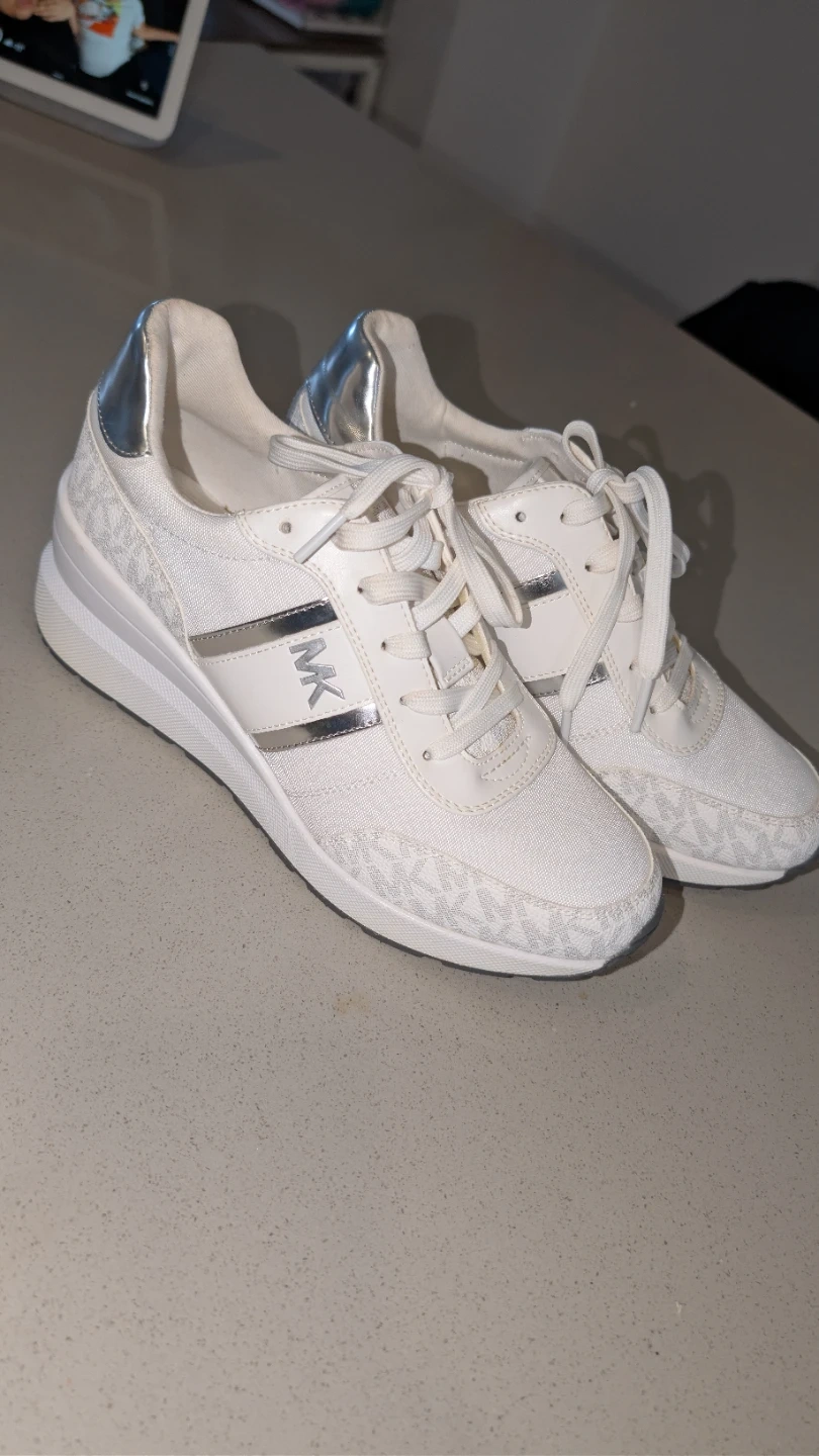 These Michael Kors sneakers feature a white canvas upper with the iconic MK logo pattern throughout. They have silver stripe accents and a secure lace-up closure. The wedge heel provides added height and style. Size is 8 1/2.