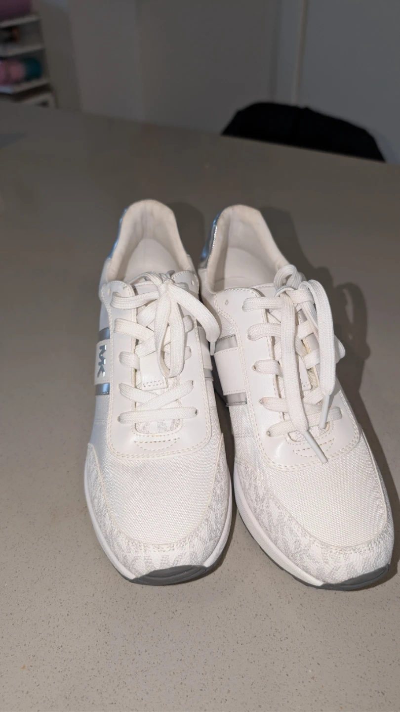 These Michael Kors sneakers feature a white canvas upper with the iconic MK logo pattern throughout. They have silver stripe accents and a secure lace-up closure. The wedge heel provides added height and style. Size is 8 1/2.