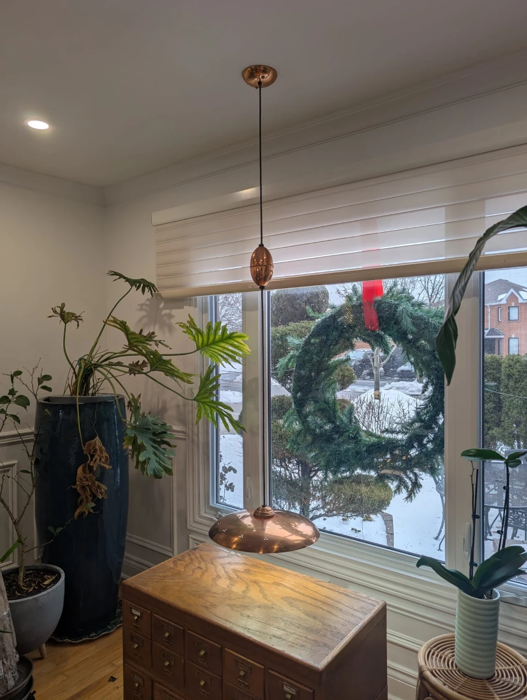 Selling a stylish copper pendant light! It would look great in any room and adds a touch of elegance. It has a unique design and a warm, inviting glow. The light can go up and down, great anywhere especially above the kitchen table