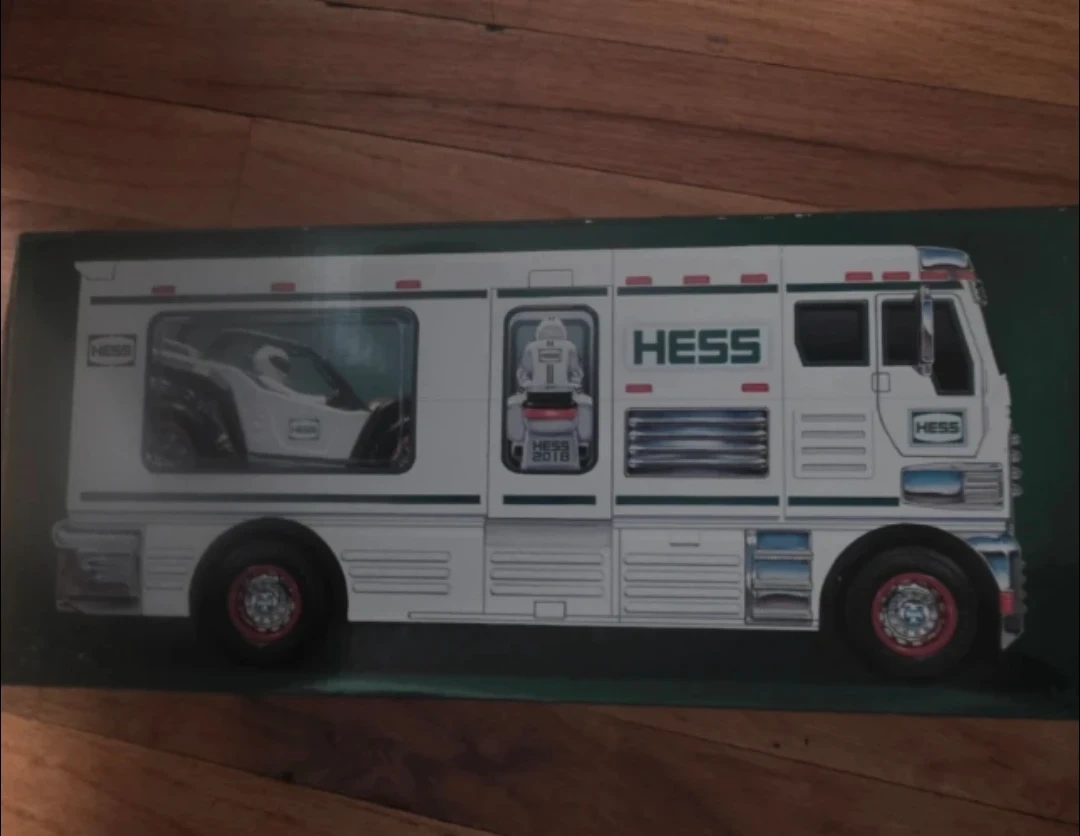 This is the 2018 Hess RV toy truck and motor home with trailer. It's made of plastic and features lights and sounds. The trailer opens with three buttons to reveal the RV inside. Includes the original box.