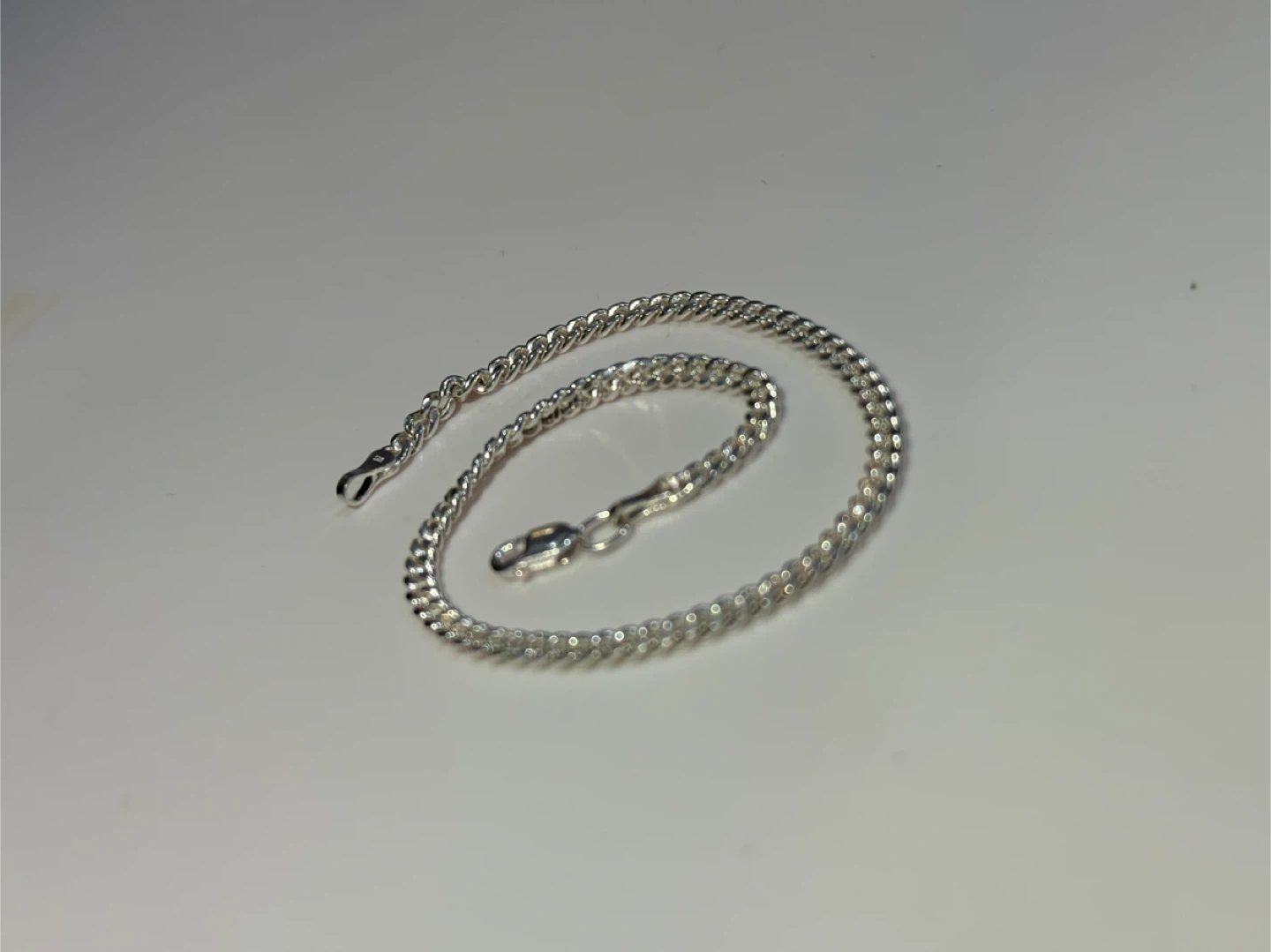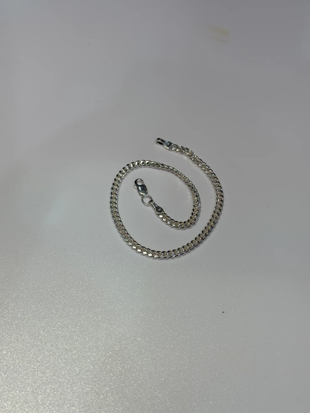 Shiny sterling silver curb chain anklet. It's approximately 9-10 inches long with a secure clasp. This anklet's simple design makes it suitable for everyday wear. It's a nice addition to any jewelry collection!