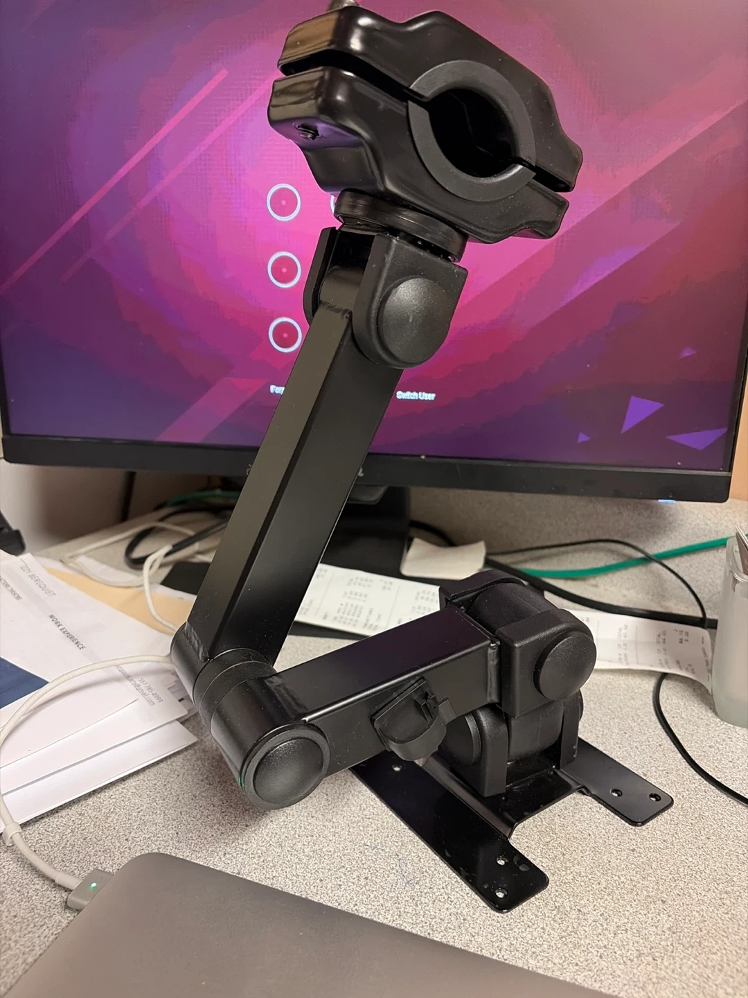 This adjustable desk mount arm clamp is made of durable black metal. It features a clamp base and an articulated arm for versatile positioning. Includes mounting hardware for secure attachment.