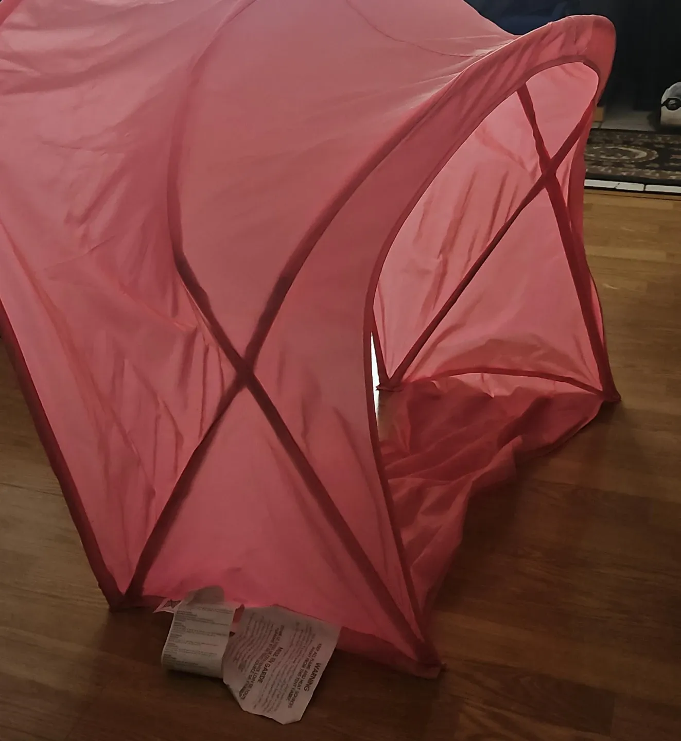 This pink play tent is made of fabric with a frame for structure. It's lightweight and easy to set up for playtime. Keep all flame and heat sources away from the tent fabric.