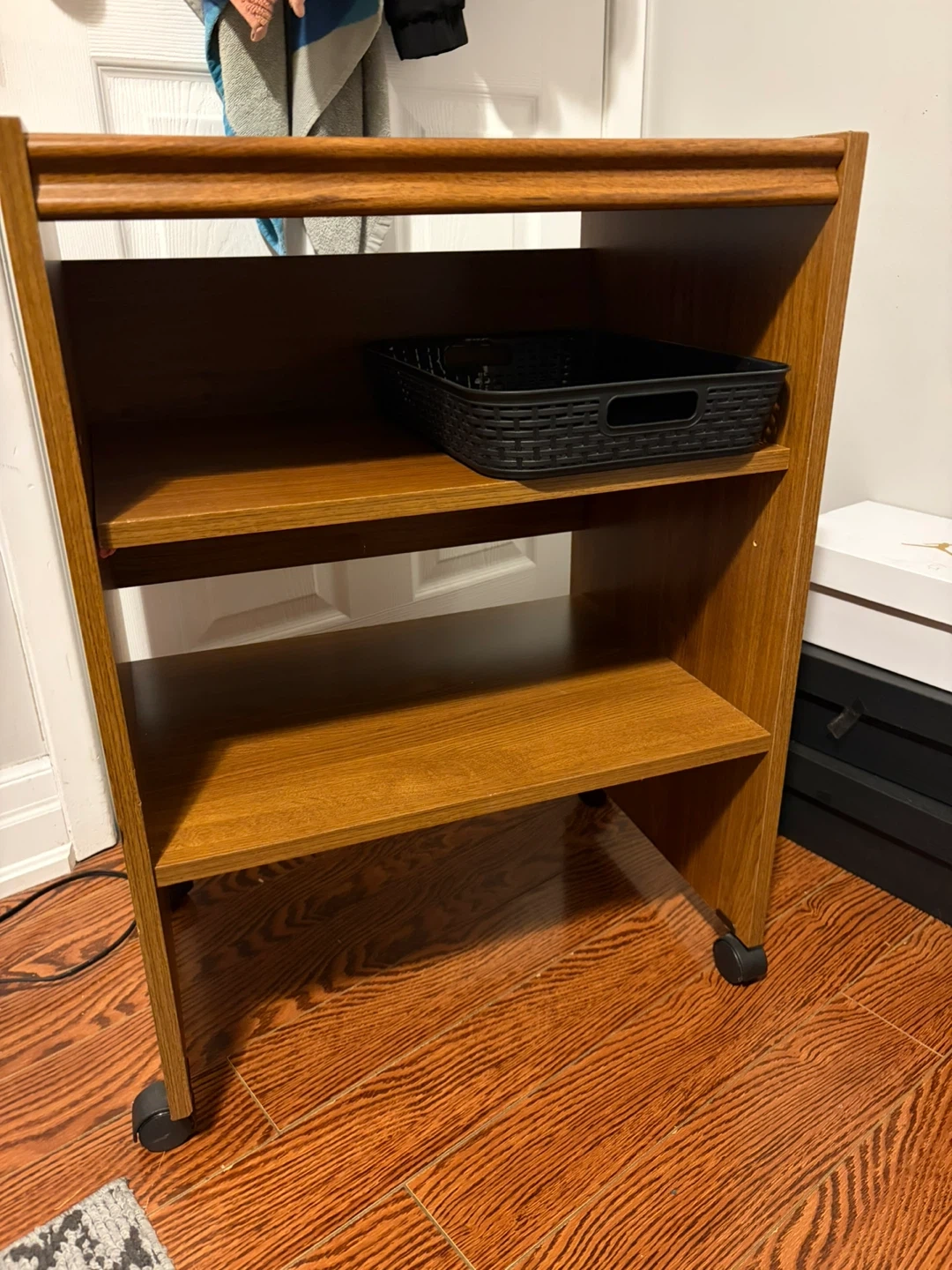 This 3-tier rolling cart is made of wood and comes with a black basket for storage. It has wheels for easy movement and a warm, wood grain finish. It's great for organizing items in any room.