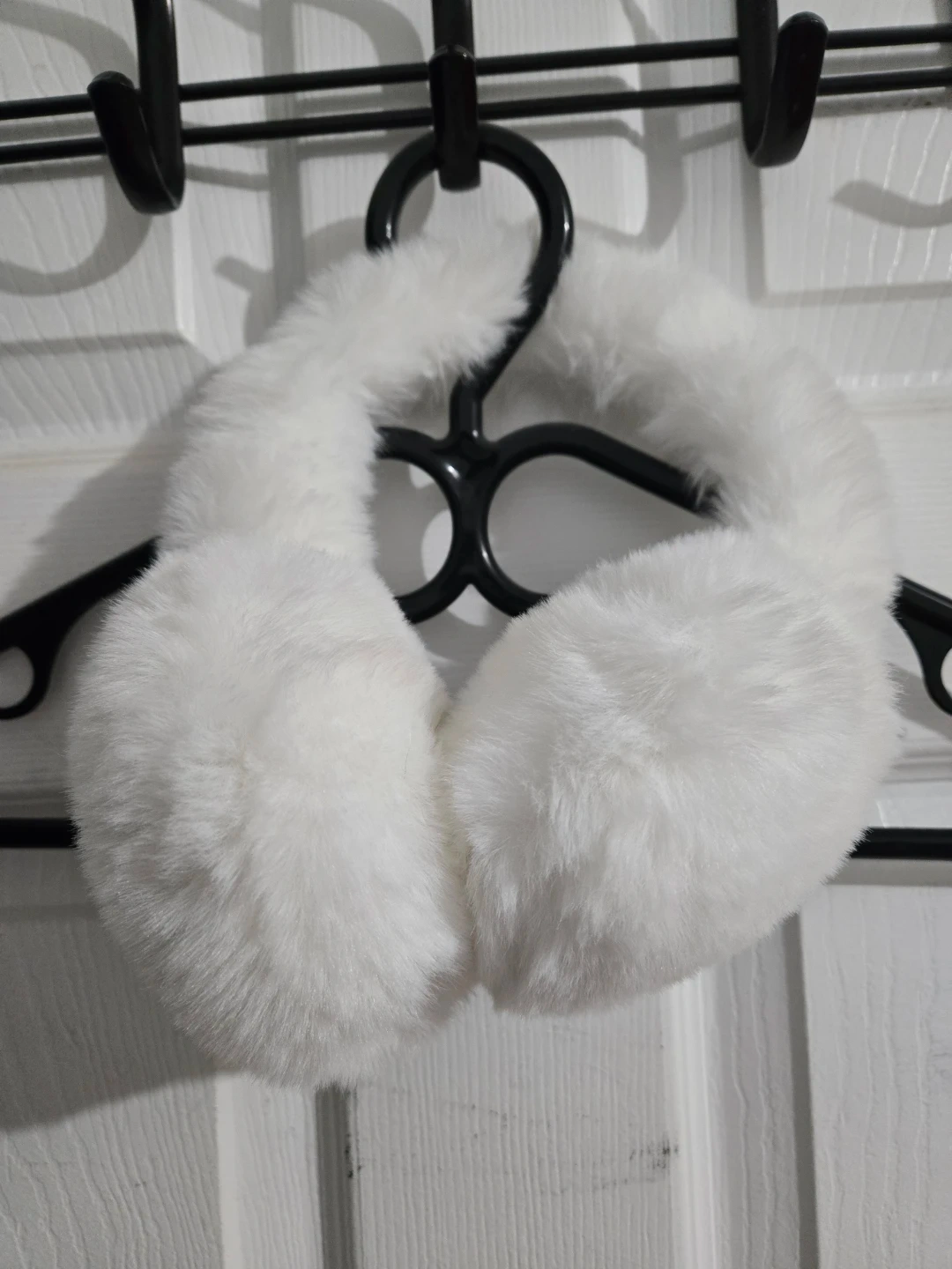 Cozy white faux fur earmuffs. Soft and fluffy material for winter warmth. These earmuffs are great for keeping ears toasty on chilly days!