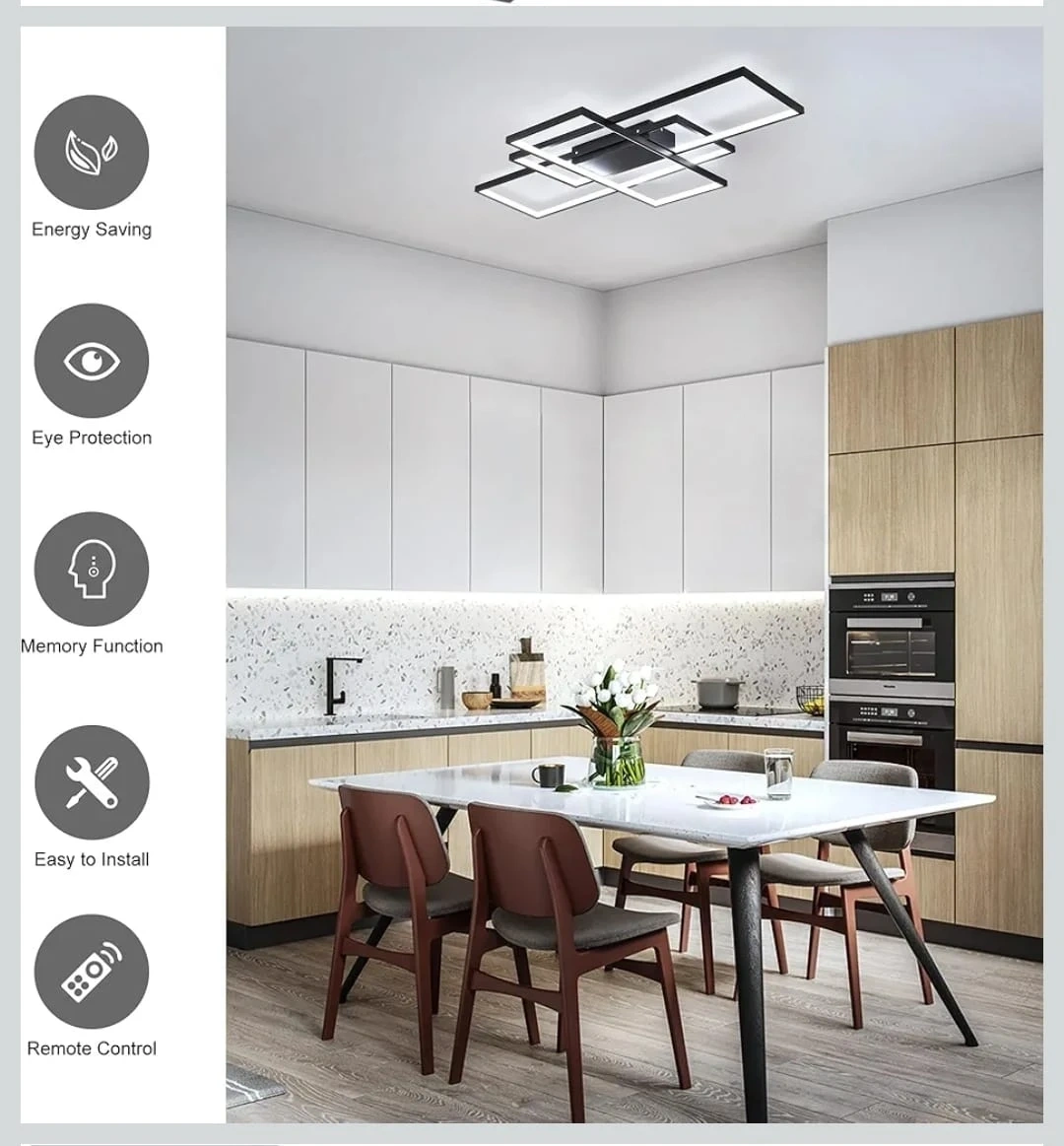 This modern ceiling light fixture features a unique geometric design with interlocking rectangles. It offers energy saving, eye protection, and comes with a remote control for easy operation. The aluminum frame provides durability.