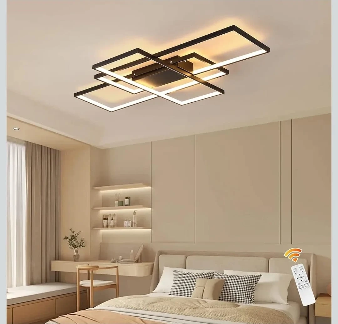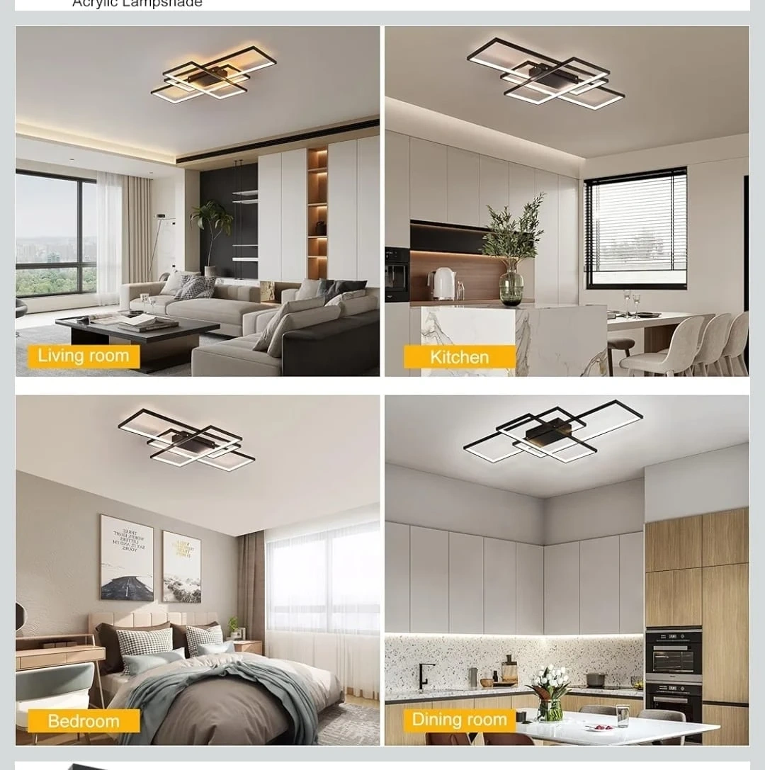This modern ceiling light fixture features a unique geometric design with interlocking rectangles. It offers energy saving, eye protection, and comes with a remote control for easy operation. The aluminum frame provides durability.