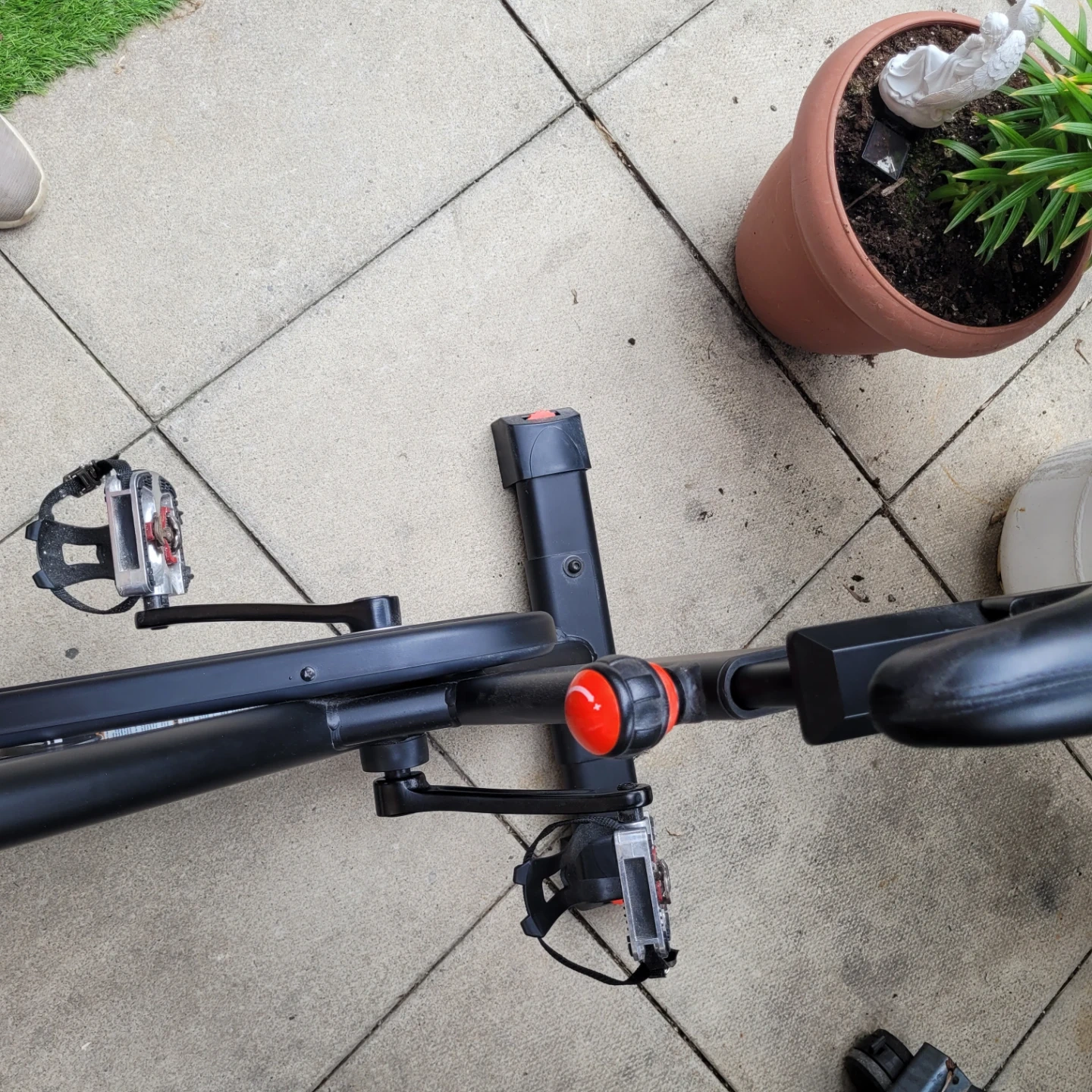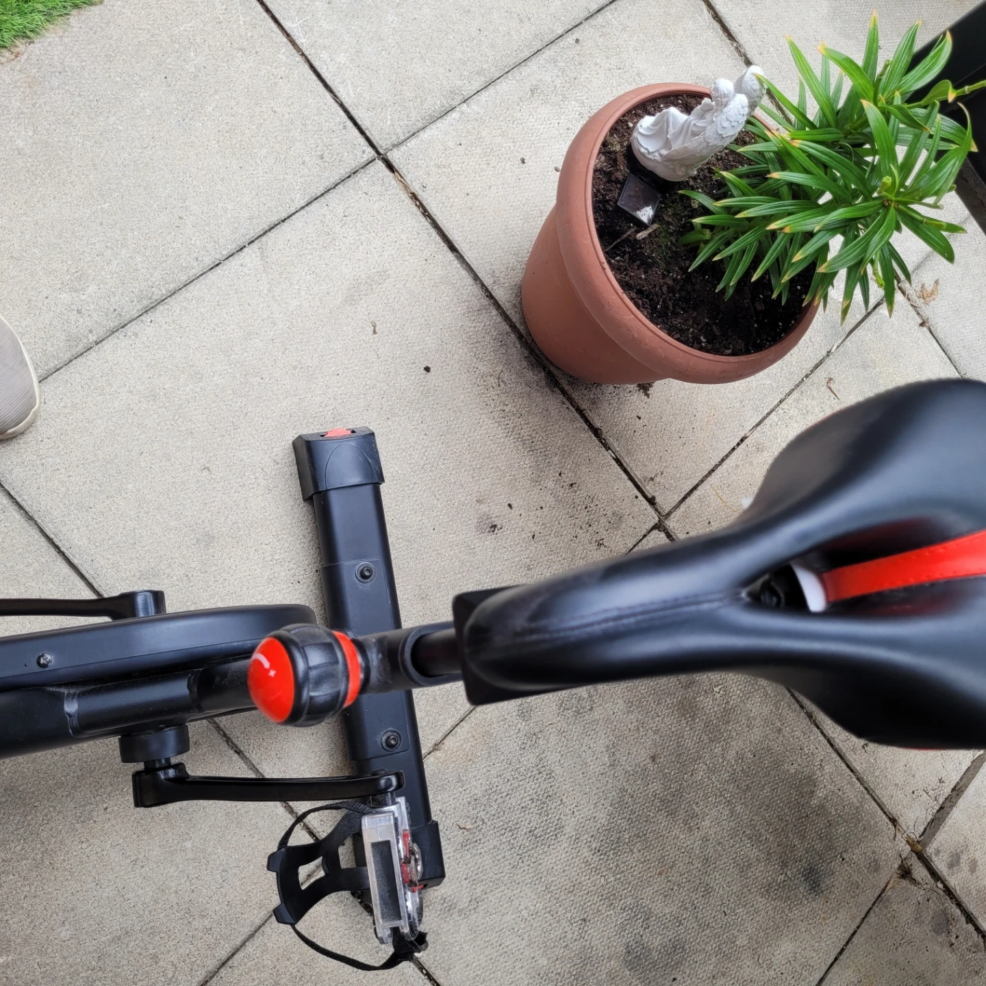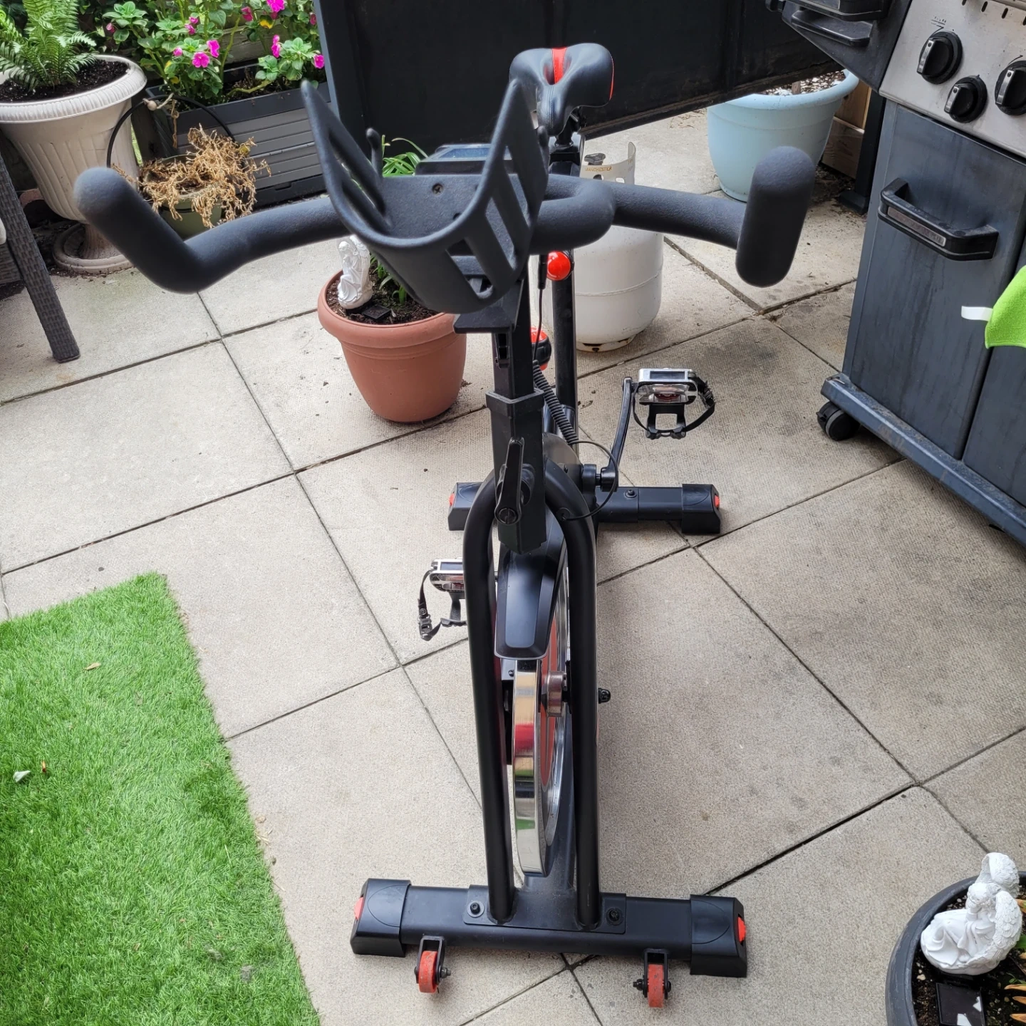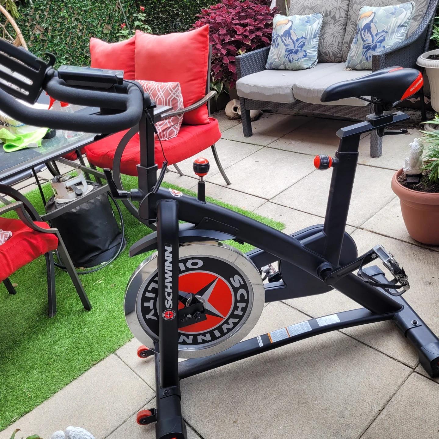 This is a Schwinn IC3 indoor cycle bike. It's black with red accents. Features adjustable seat and handlebars. The bike has toe cages on the pedals. Great for home workouts!